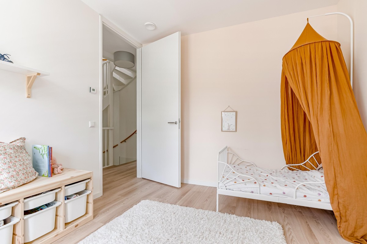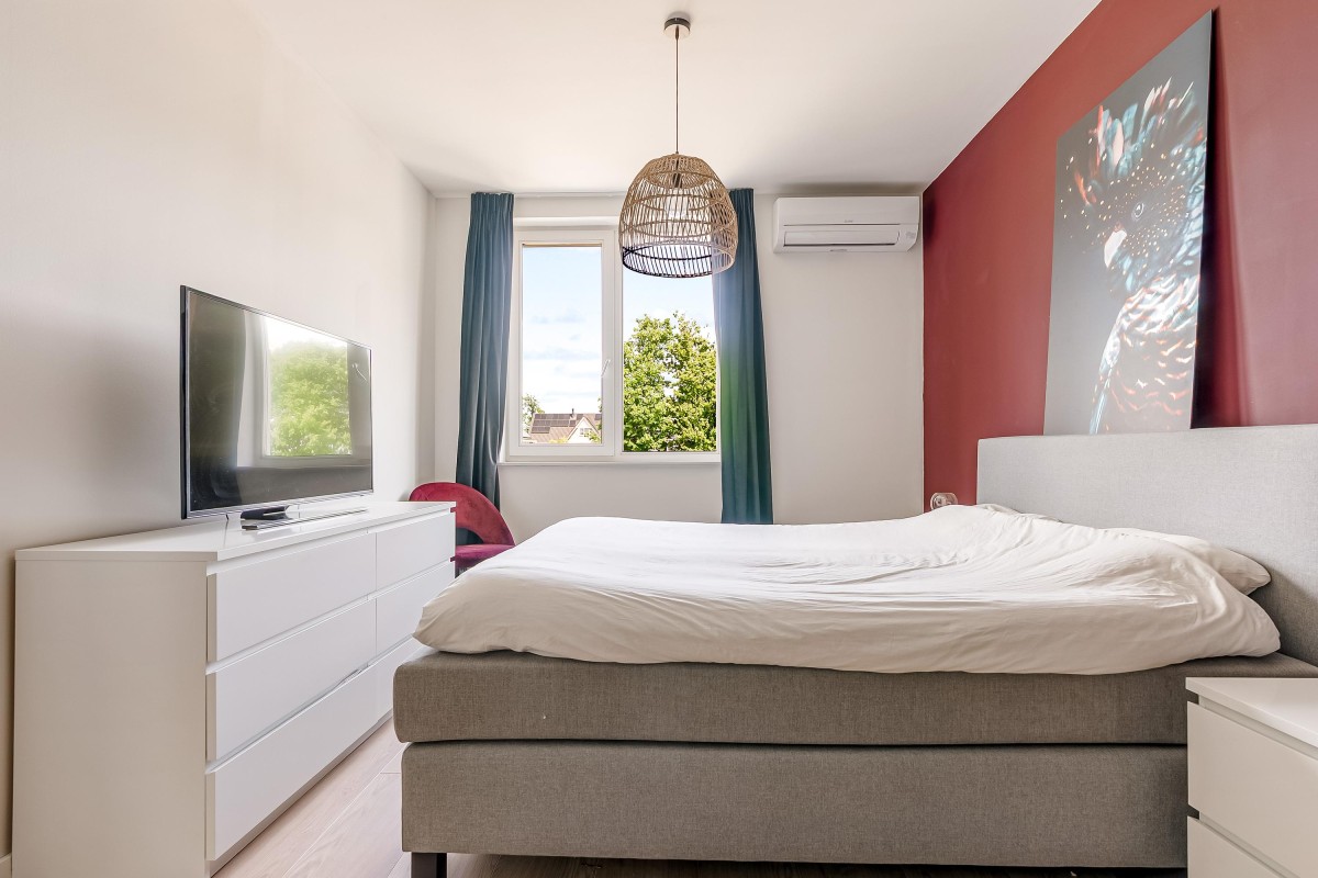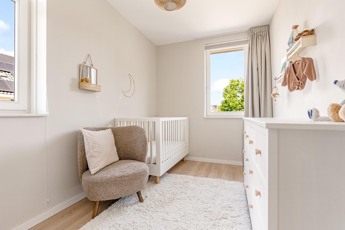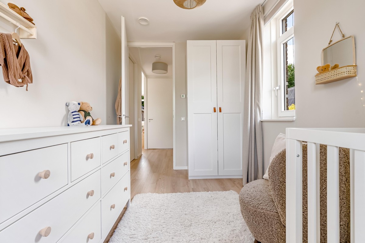De gehele verdieping is afgewerkt met een laminaatvloer voorzien van vloerverwarming en strak gestuukte wanden.