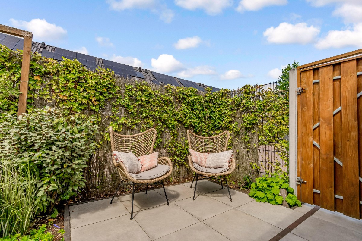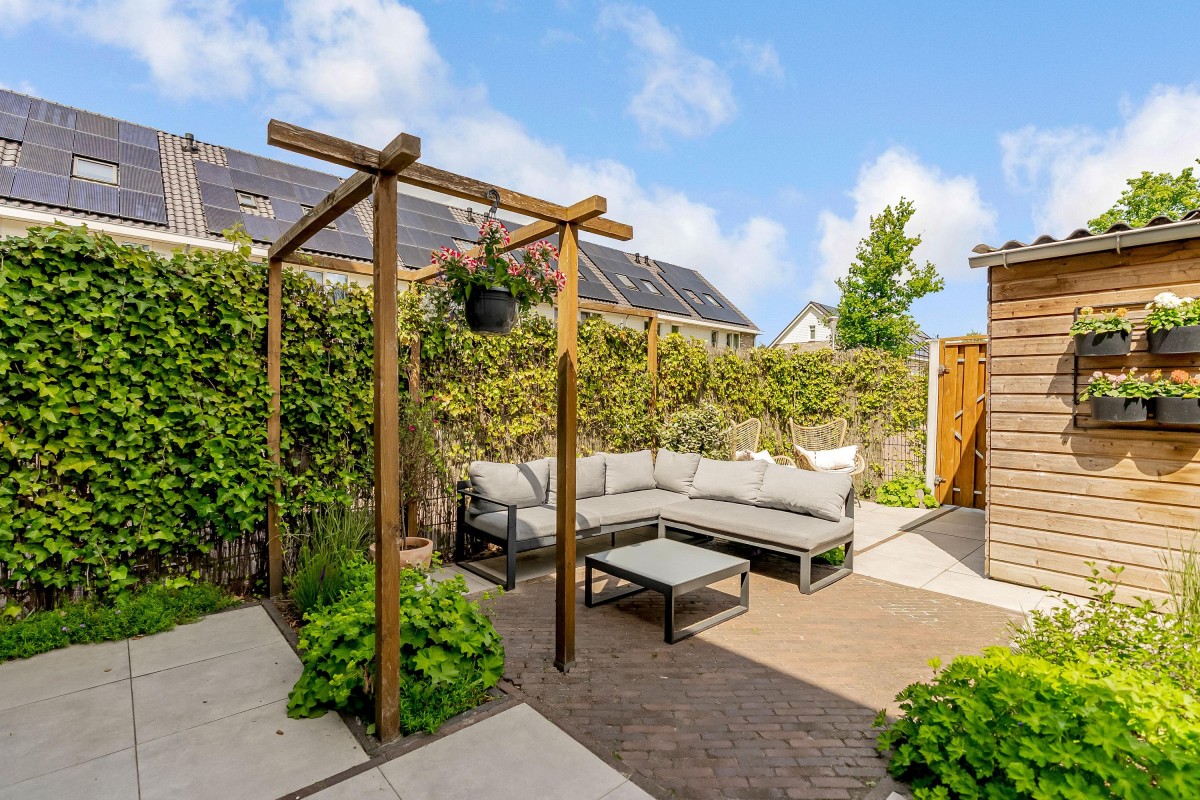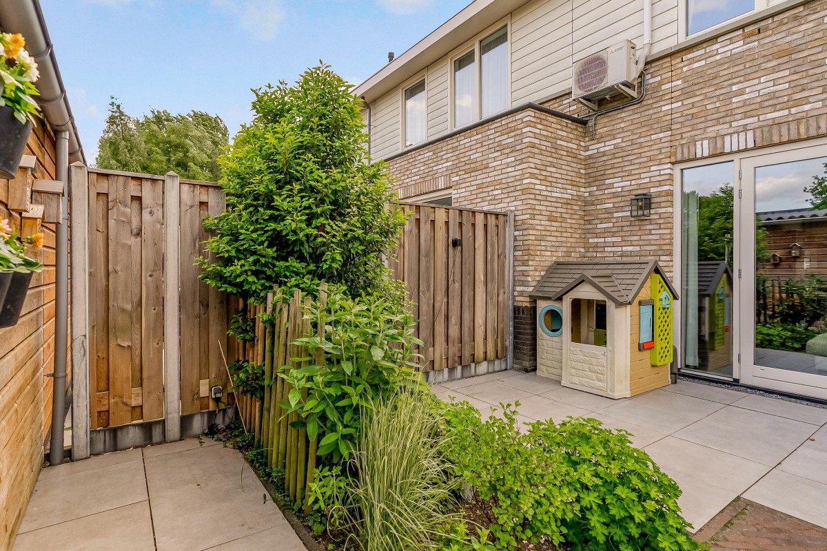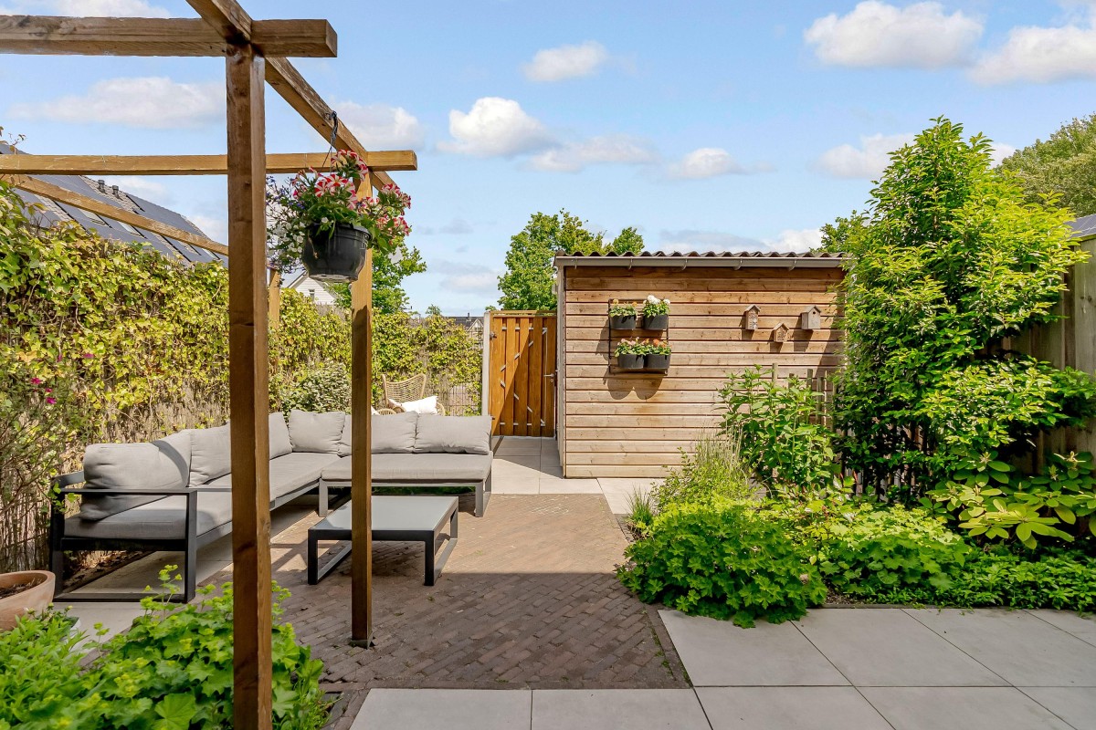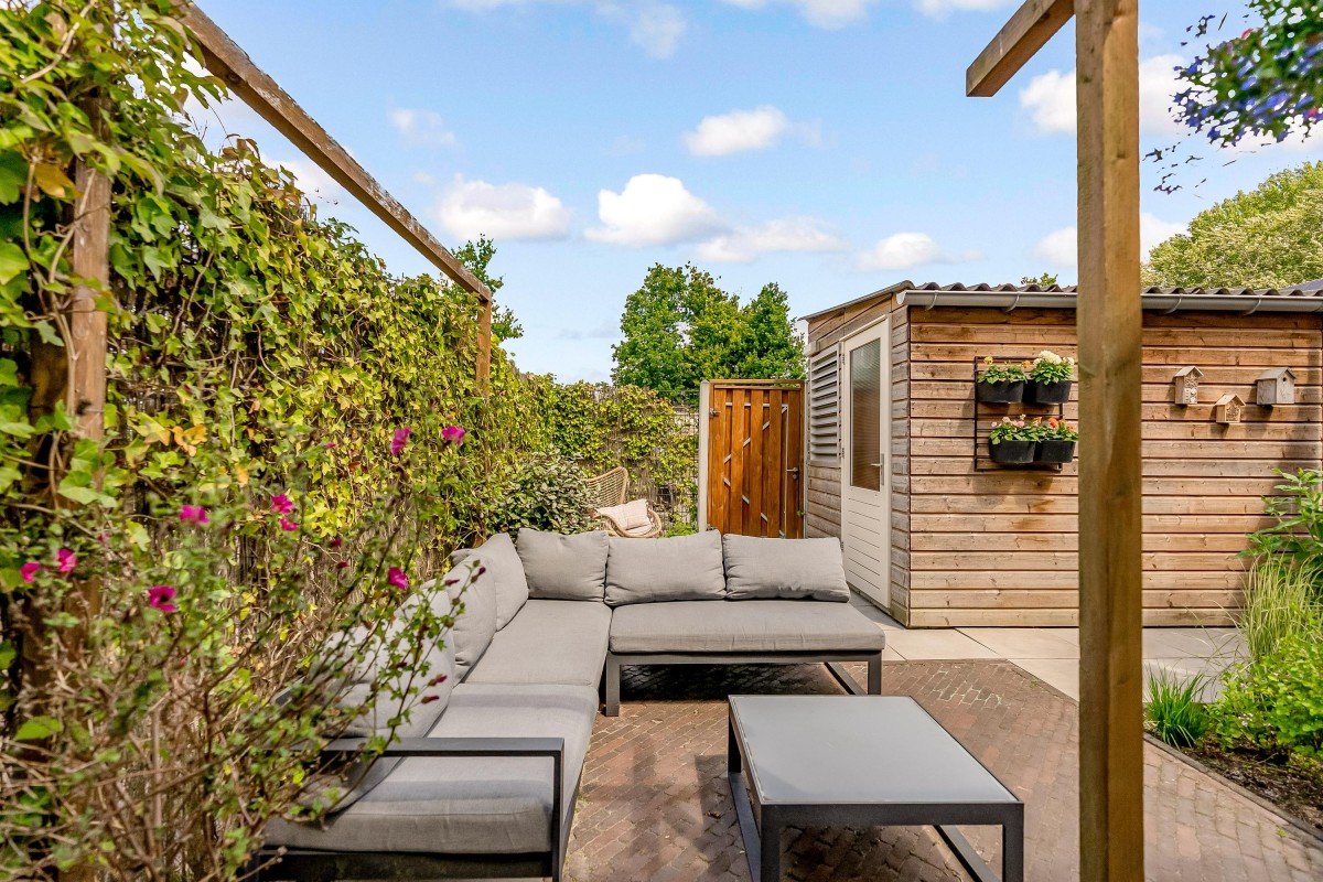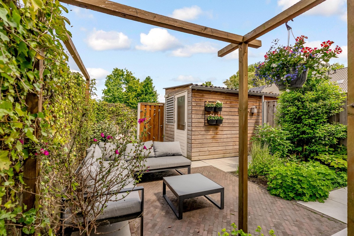 De fraai aangelegde achtertuin op het oosten beschikt over een terras, beplanting, een berging en een achterom. Dankzij de ligging kunt u gedurende de dag zowel van de zon als van de schaduw genieten.