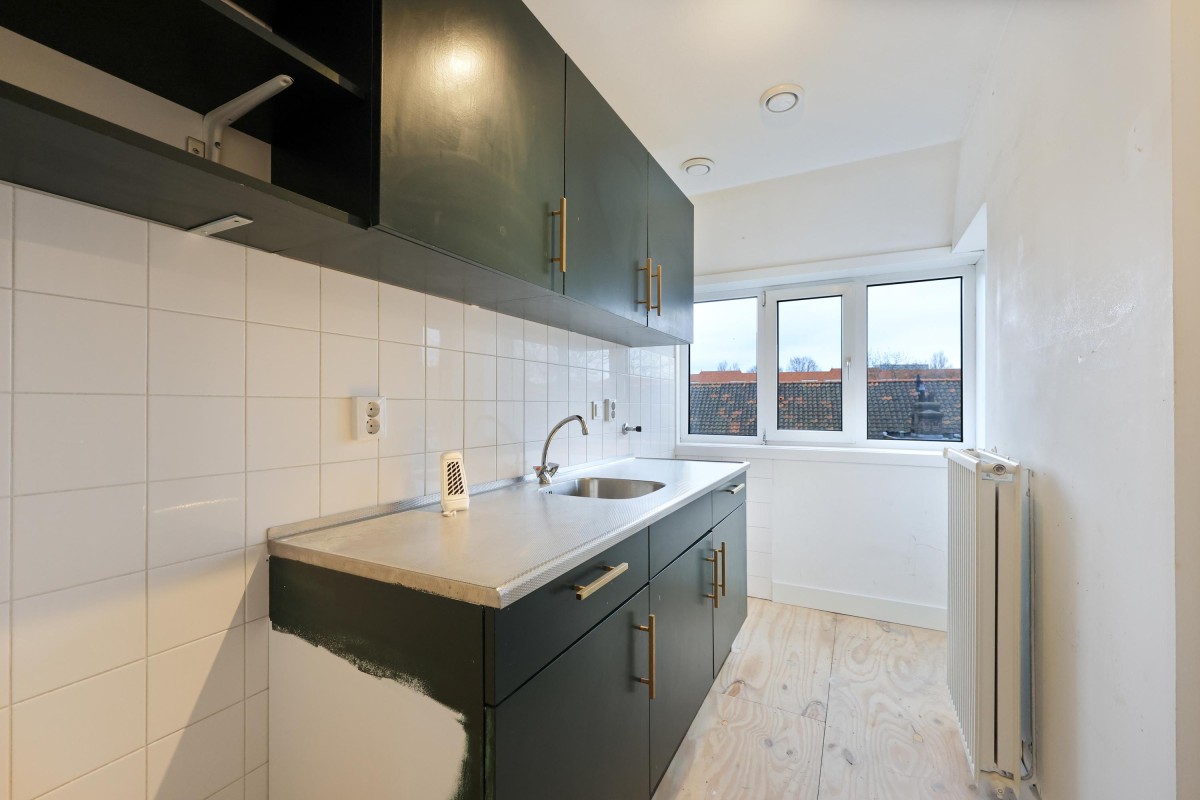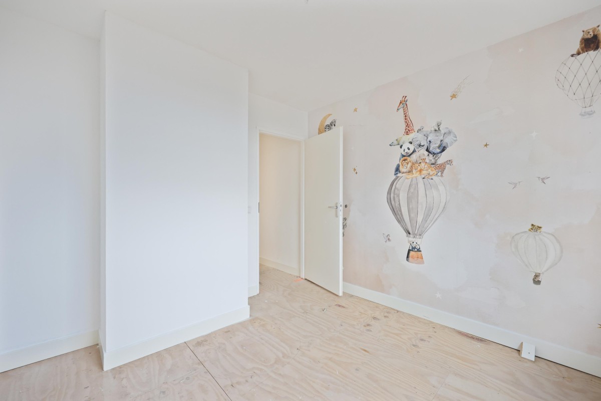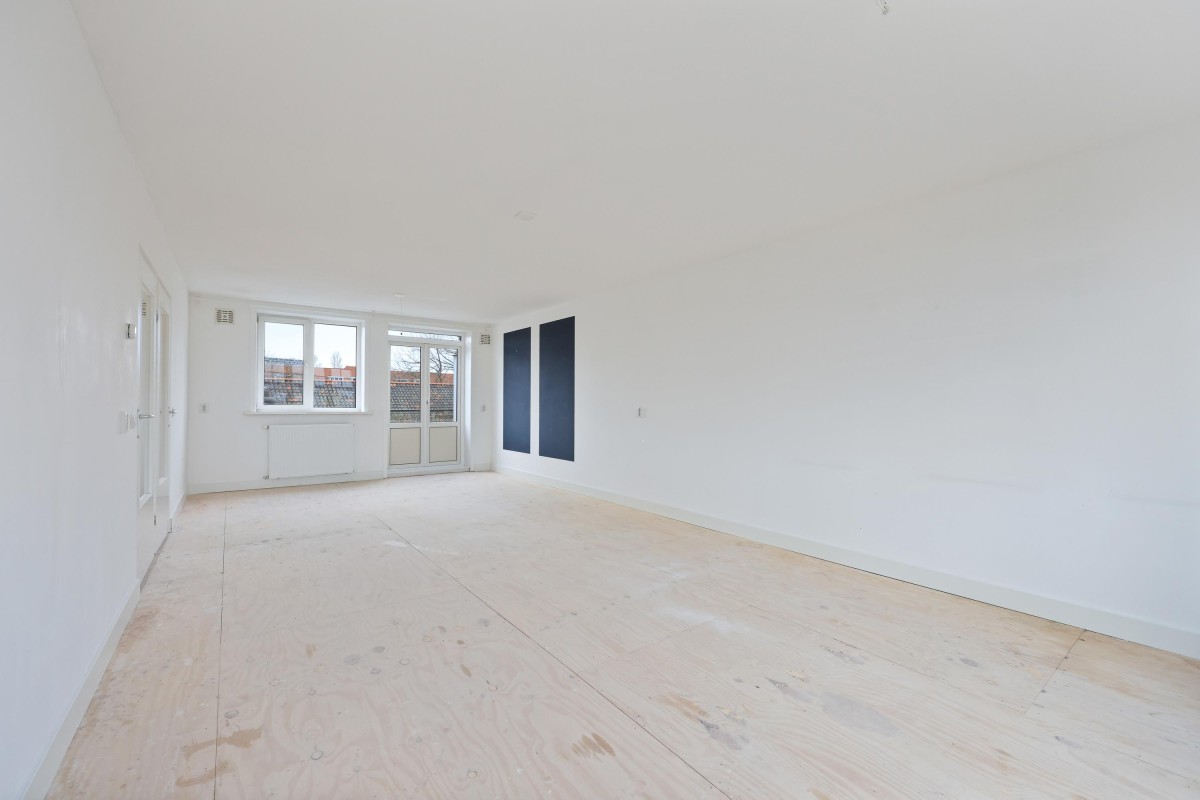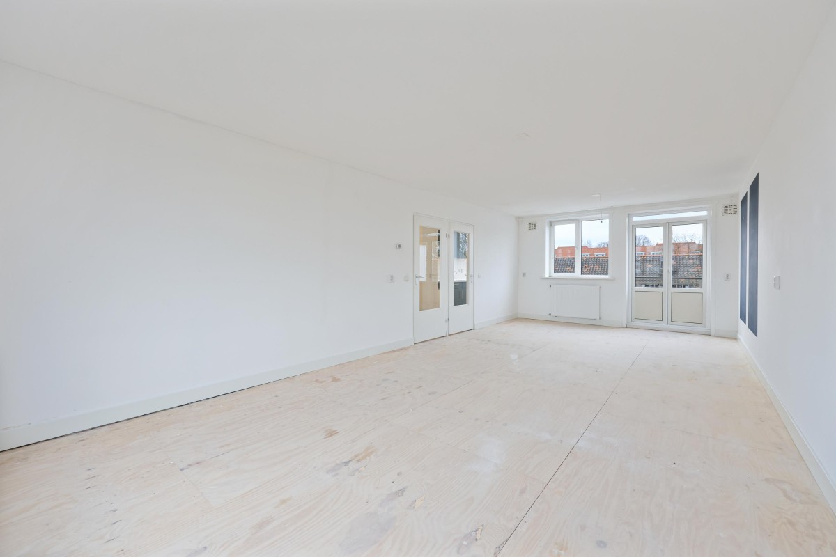 Via het gemeenschappelijke trappenhuis bereikt u het appartement op de derde etage. Bij binnenkomst komt u in de centrale hal, die toegang biedt tot verschillende ruimtes. De eerste goed bemeten slaapkamer bevindt zich aan de voorzijde van het pand. Aangrenzend is de ruime woonkamer van maar liefst 33 m², met genoeg plek voor een gezellige zithoek en een grote eettafel.
