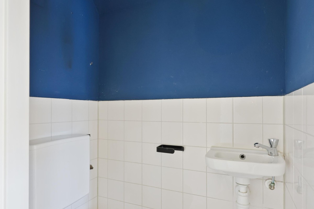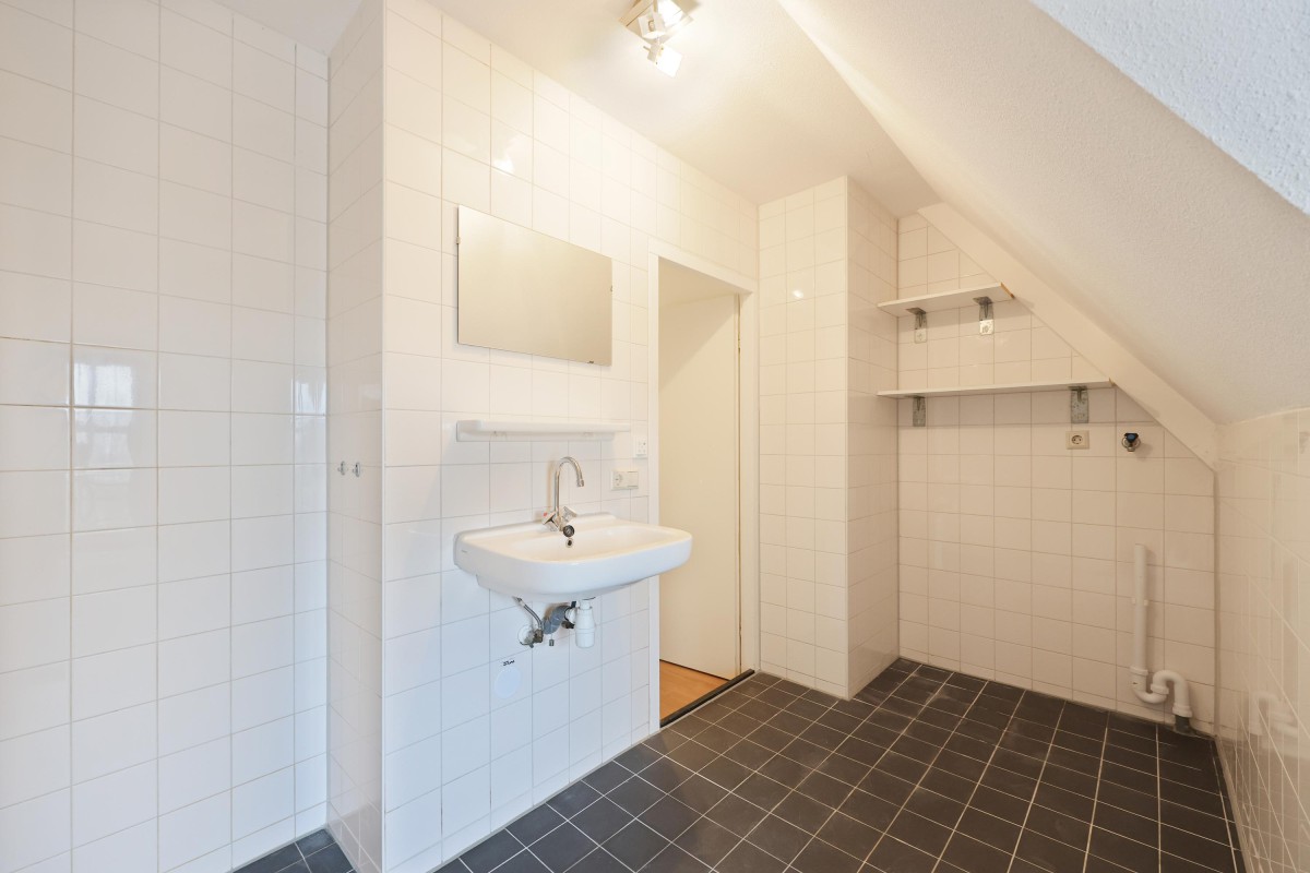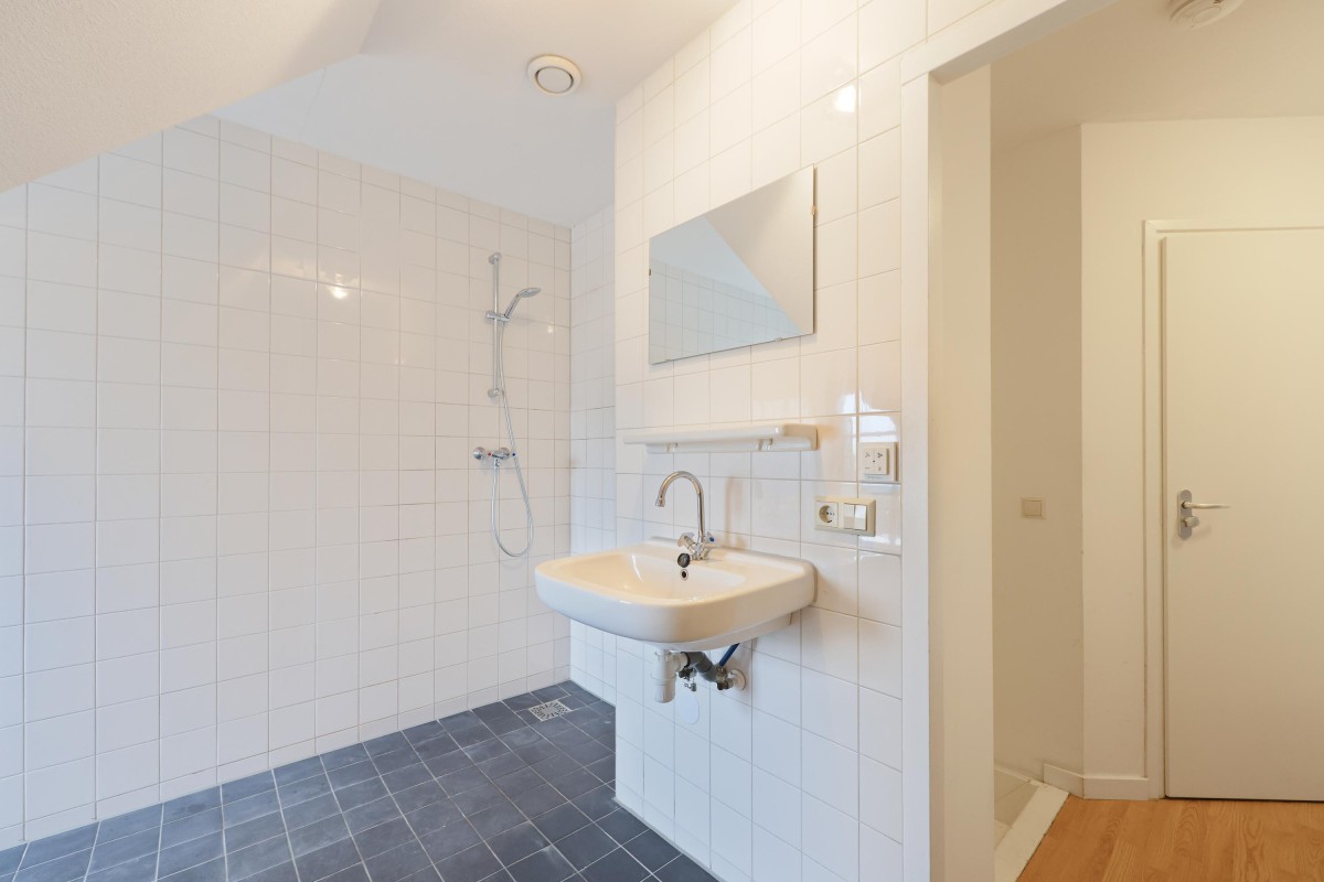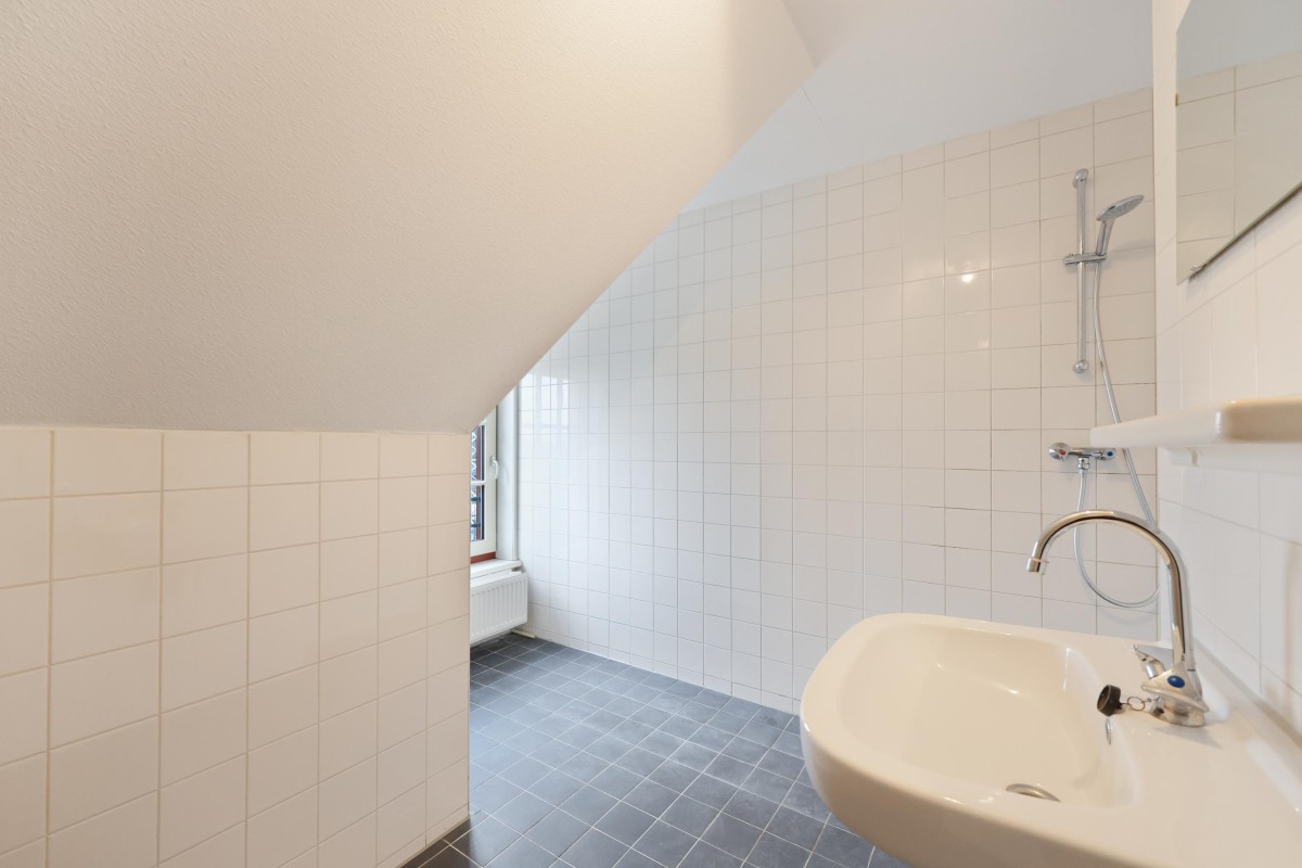 Op de bovenste etage bevindt zich de tweede slaapkamer, met toegang tot een inpandige berging. De badkamer, gelegen aan de voorzijde van het pand, is uitgerust met een douche, wastafel en aansluiting voor de wasmachine. Op deze verdieping treft u eveneens een toilet met fonteintje aan in een aparte ruimte.