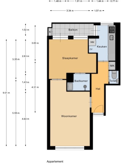 Via het gemeenschappelijke trappenhuis bereikt u het appartement op de derde etage. U komt binnen in de hal, die toegang biedt tot verschillende vertrekken.