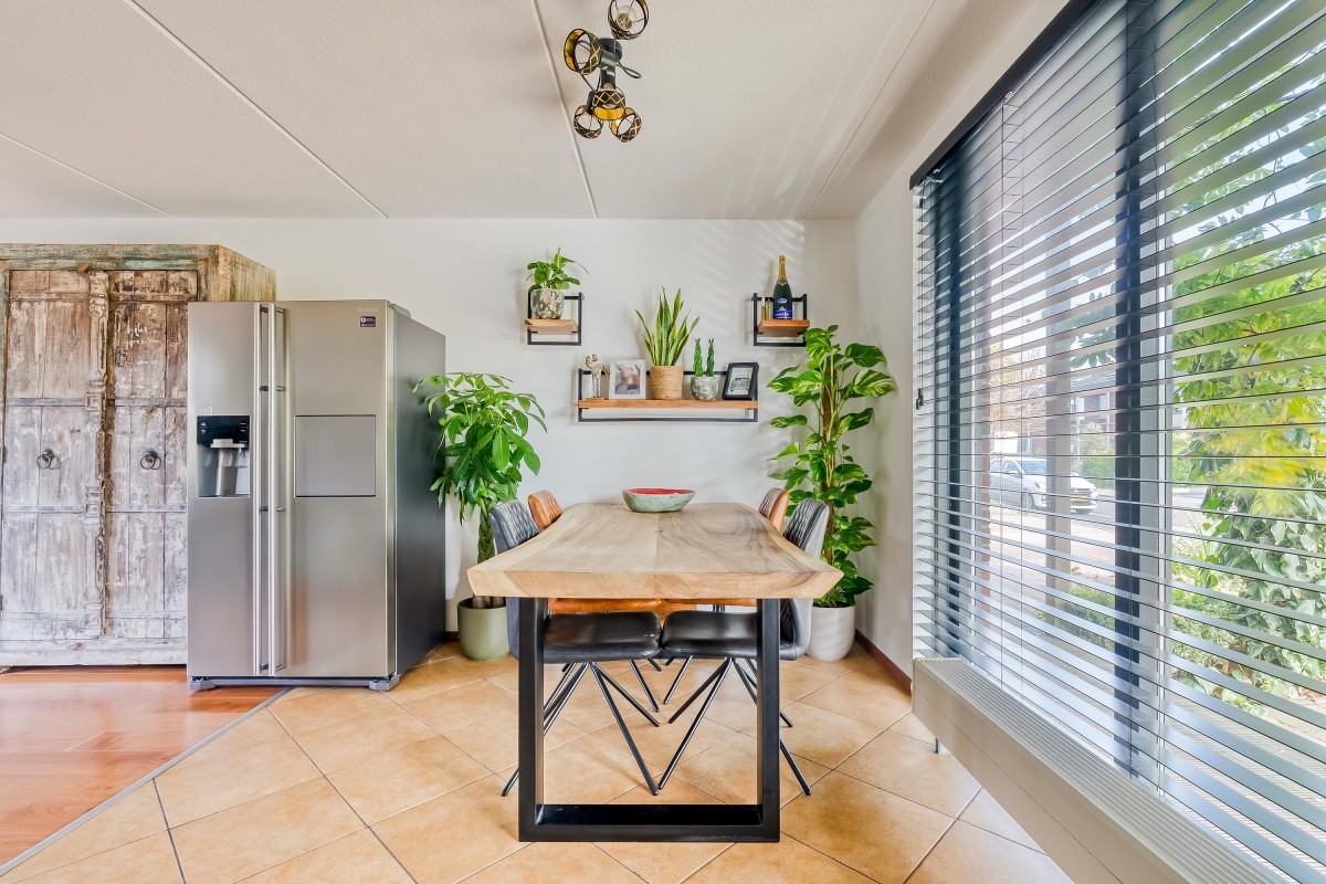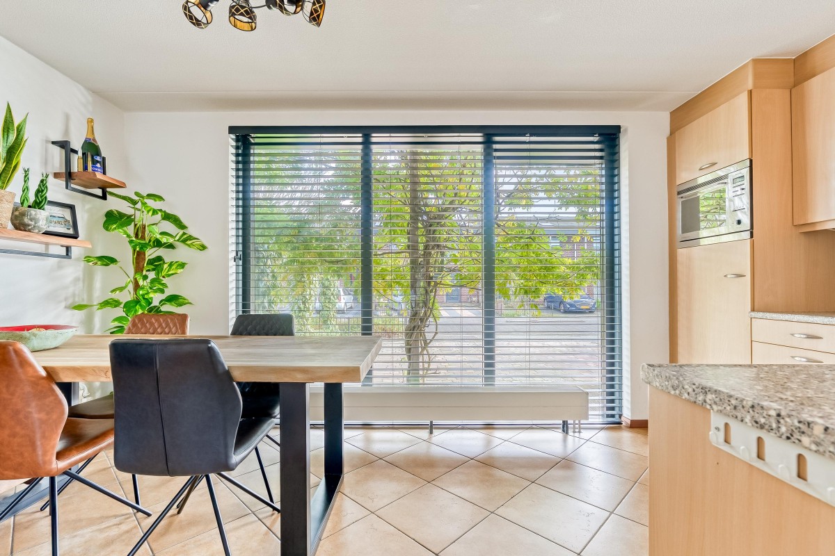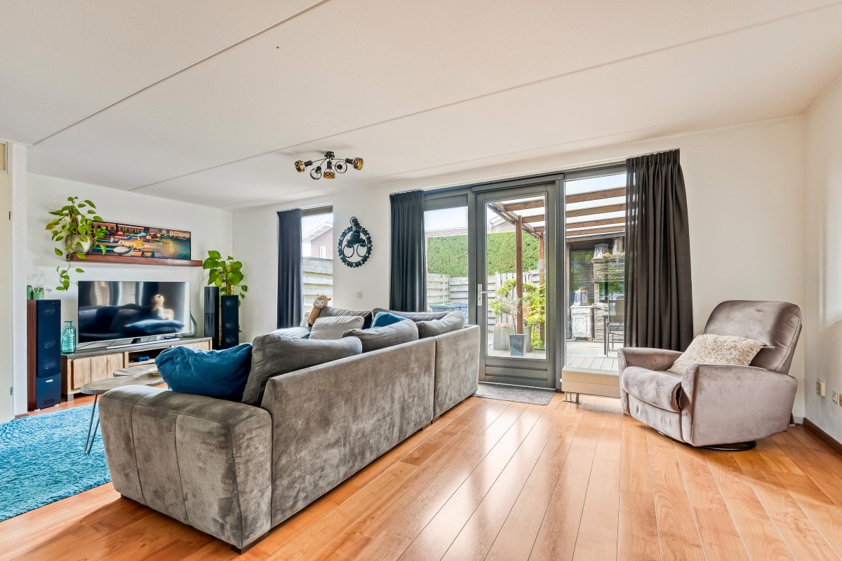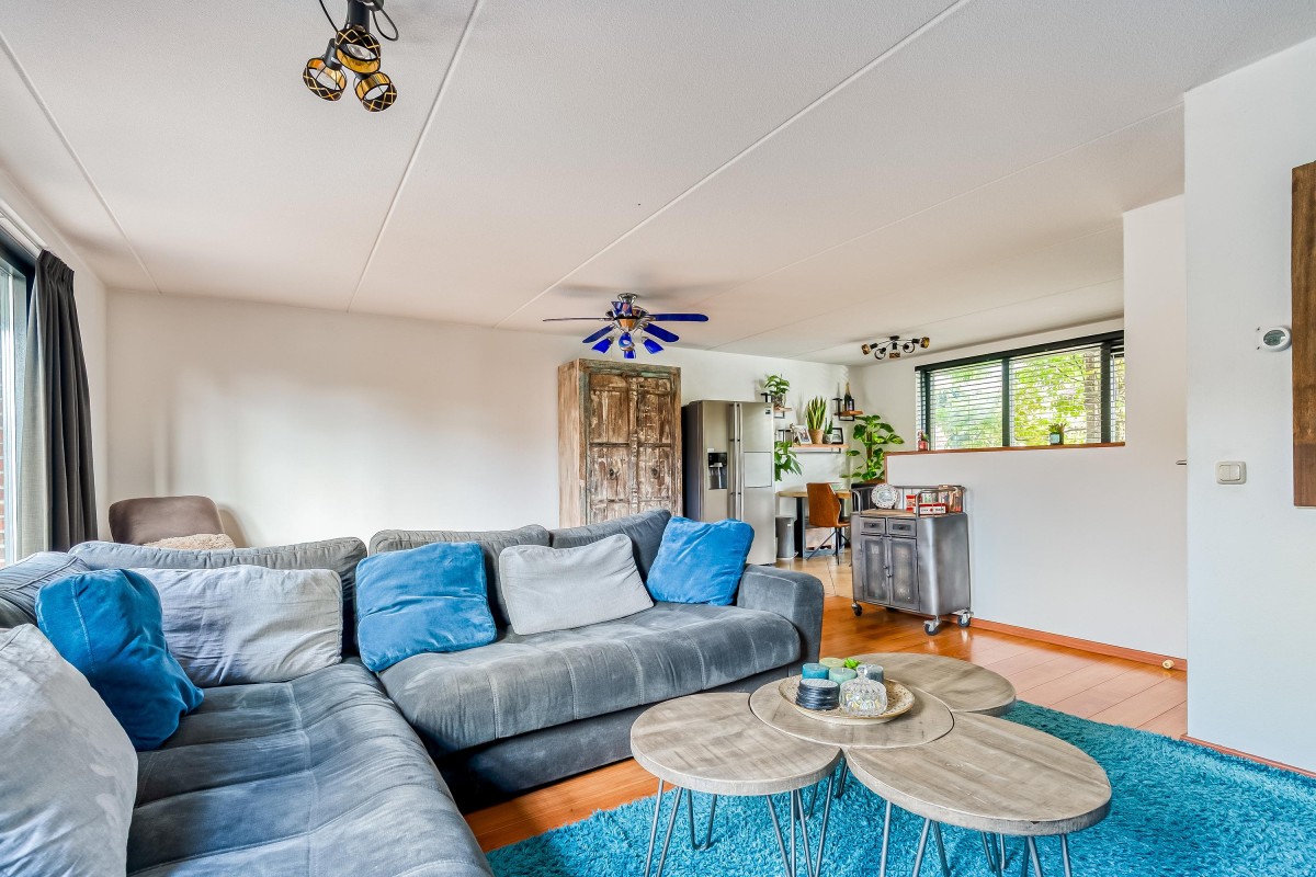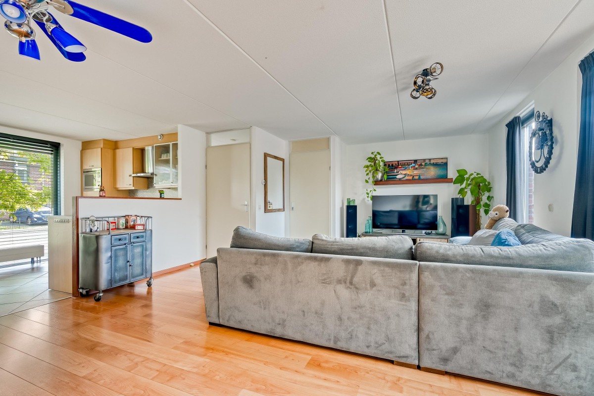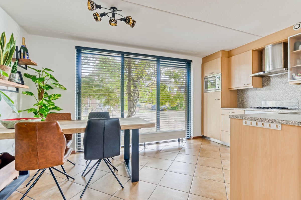 Je komt binnen in de hal, waar je toegang hebt tot de meterkast met glasvezelaansluiting, een toilet met fontein, de trap naar de eerste verdieping en de woonruimte. Aan de zijkant van de woonkamer bevindt zich een handige trapkast. De woonkamer is extra breed en voorzien van een laminaatvloer. Door de brede raampartijen komt er veel natuurlijk licht binnen en heb je goed zicht op de tuin, die via de openslaande deur bereikbaar is. De halfopen keuken ligt aan de voorzijde van de woning en is voorzien van inbouwapparatuur, zoals een combi-oven, een 4-pits gasfornuis, een afzuigkap en een vaatwasser. De vloer is betegeld met plavuizen en biedt voldoende ruimte voor een eettafel.