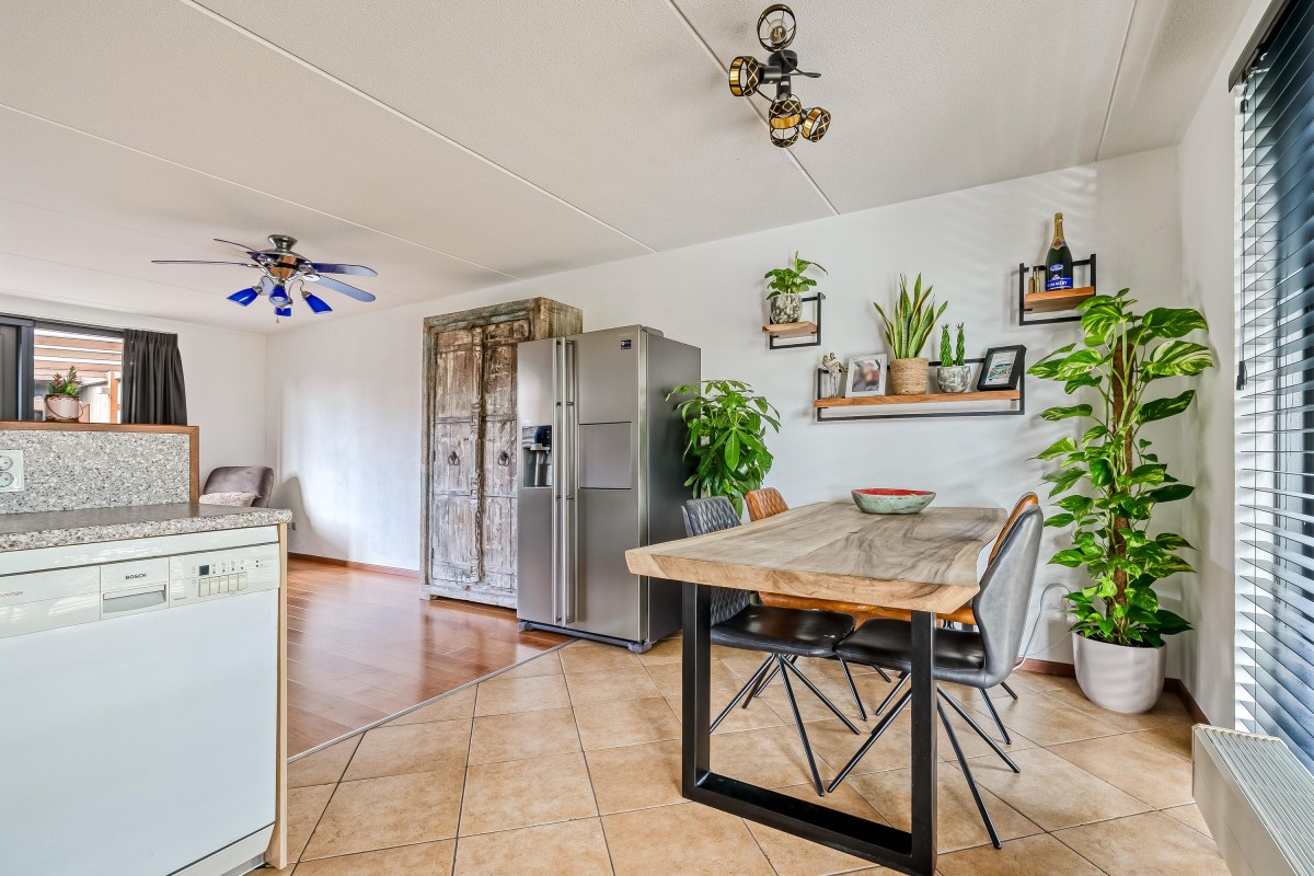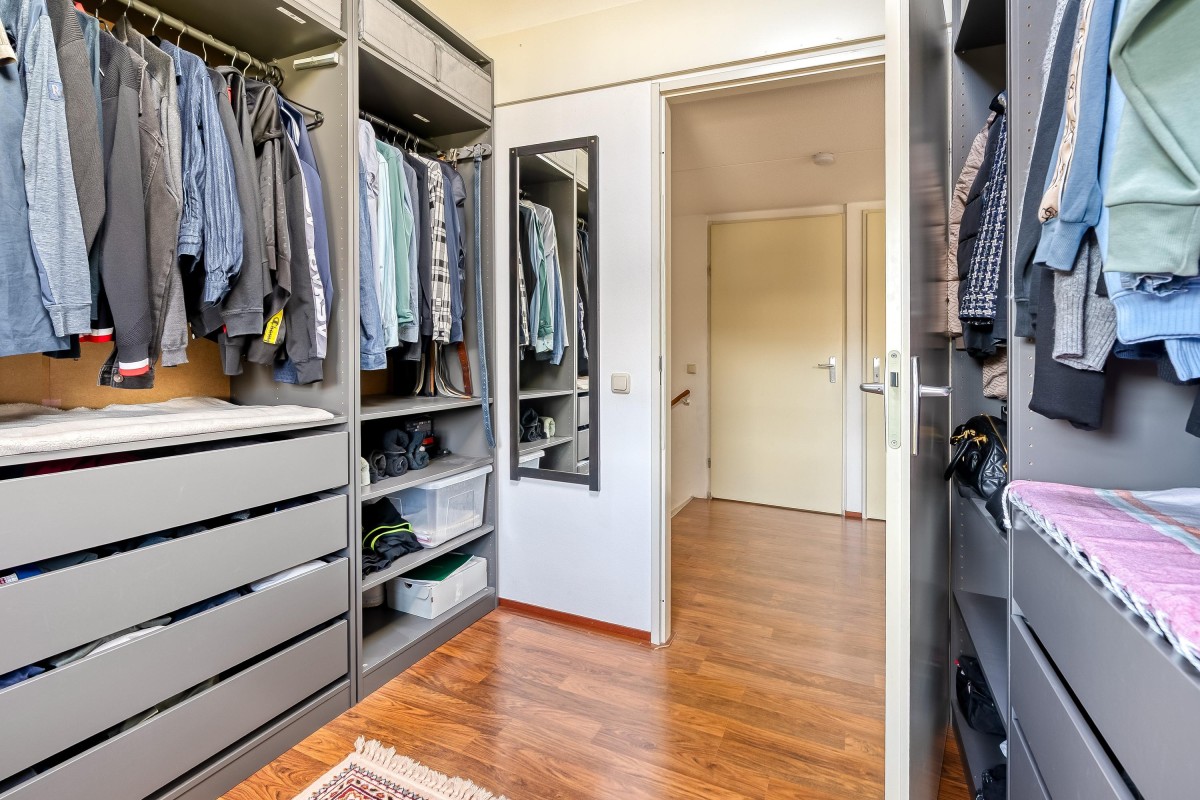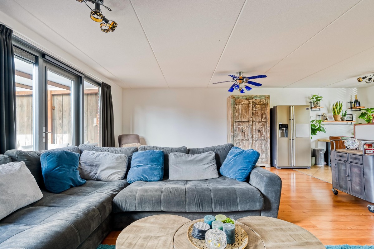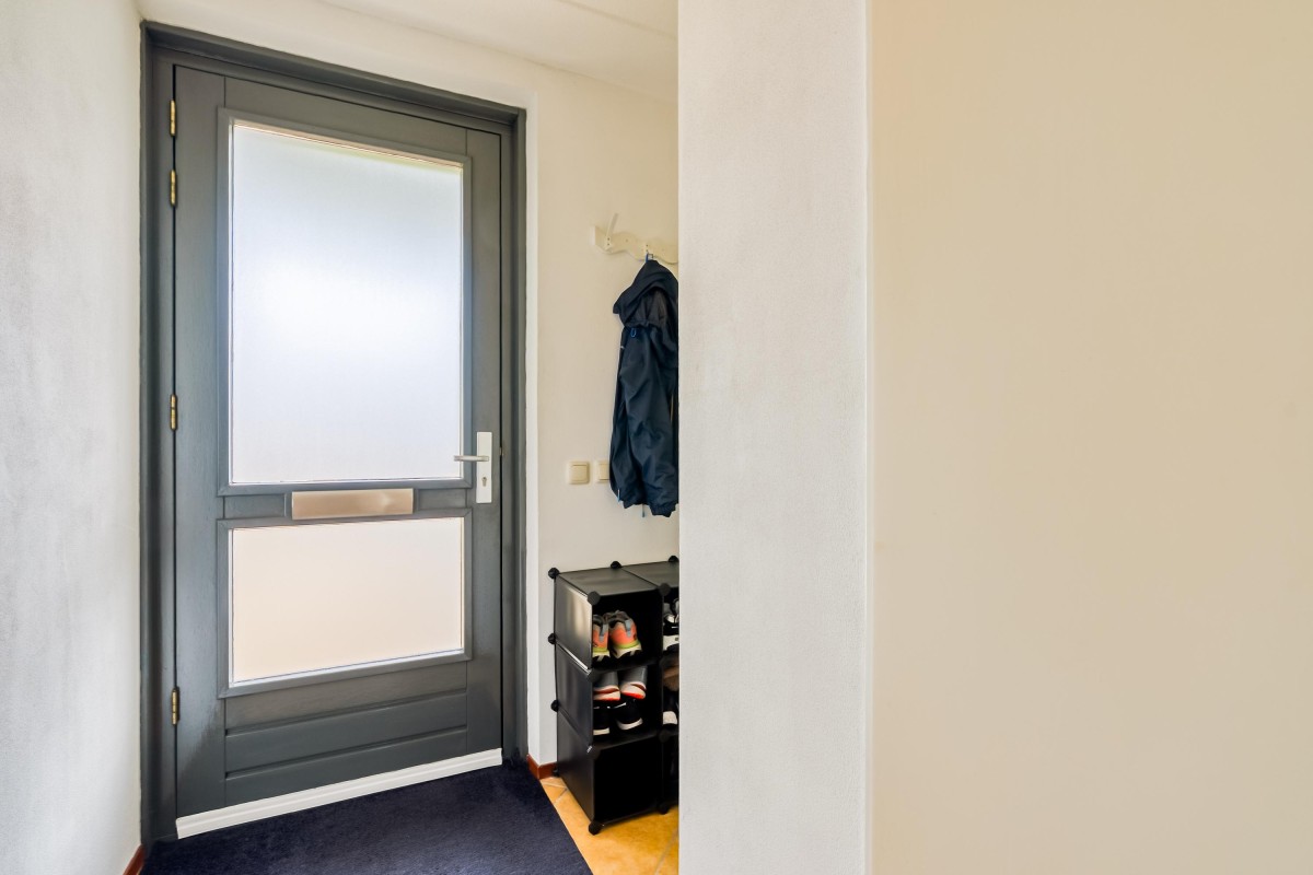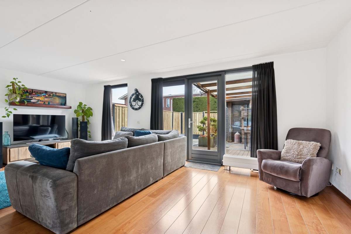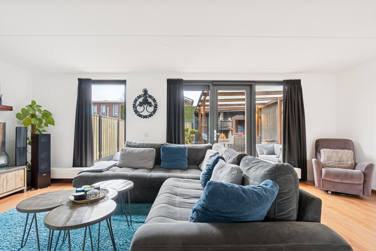 Je komt binnen in de hal, waar je toegang hebt tot de meterkast met glasvezelaansluiting, een toilet met fontein, de trap naar de eerste verdieping en de woonruimte. Aan de zijkant van de woonkamer bevindt zich een handige trapkast. De woonkamer is extra breed en voorzien van een laminaatvloer. Door de brede raampartijen komt er veel natuurlijk licht binnen en heb je goed zicht op de tuin, die via de openslaande deur bereikbaar is. De halfopen keuken ligt aan de voorzijde van de woning en is voorzien van inbouwapparatuur, zoals een combi-oven, een 4-pits gasfornuis, een afzuigkap en een vaatwasser. De vloer is betegeld met plavuizen en biedt voldoende ruimte voor een eettafel.