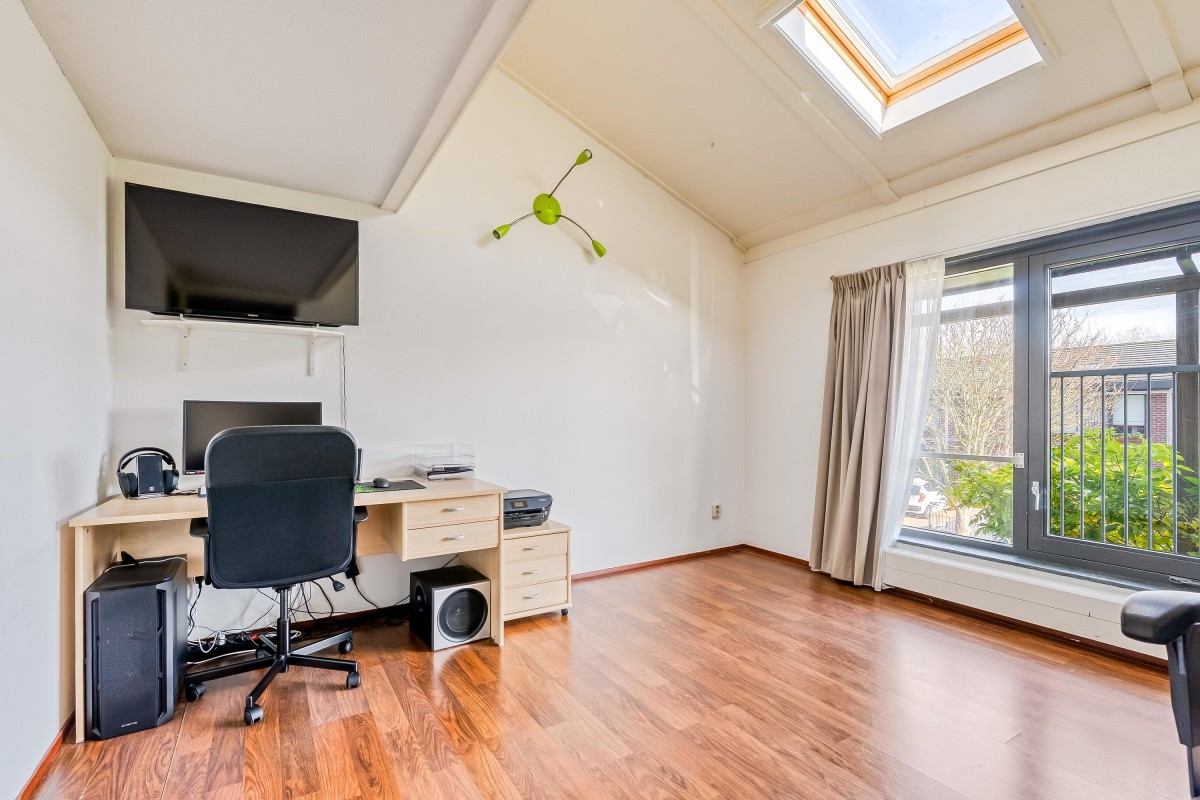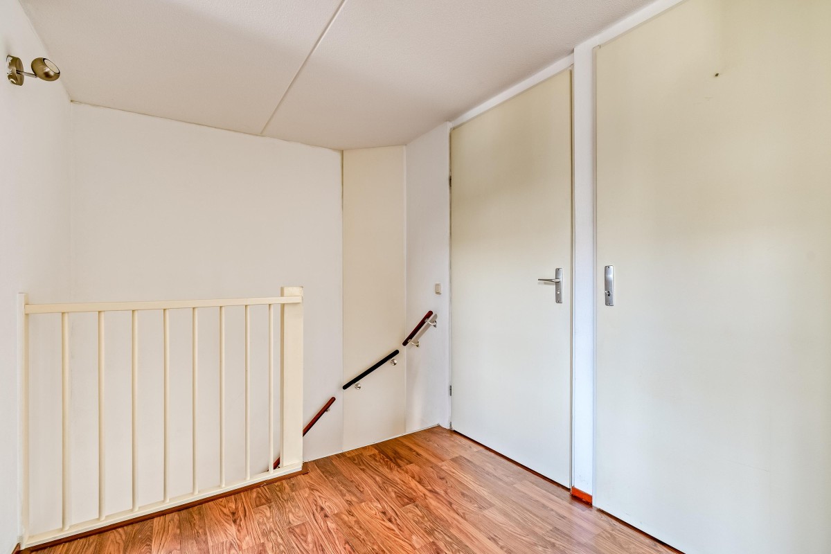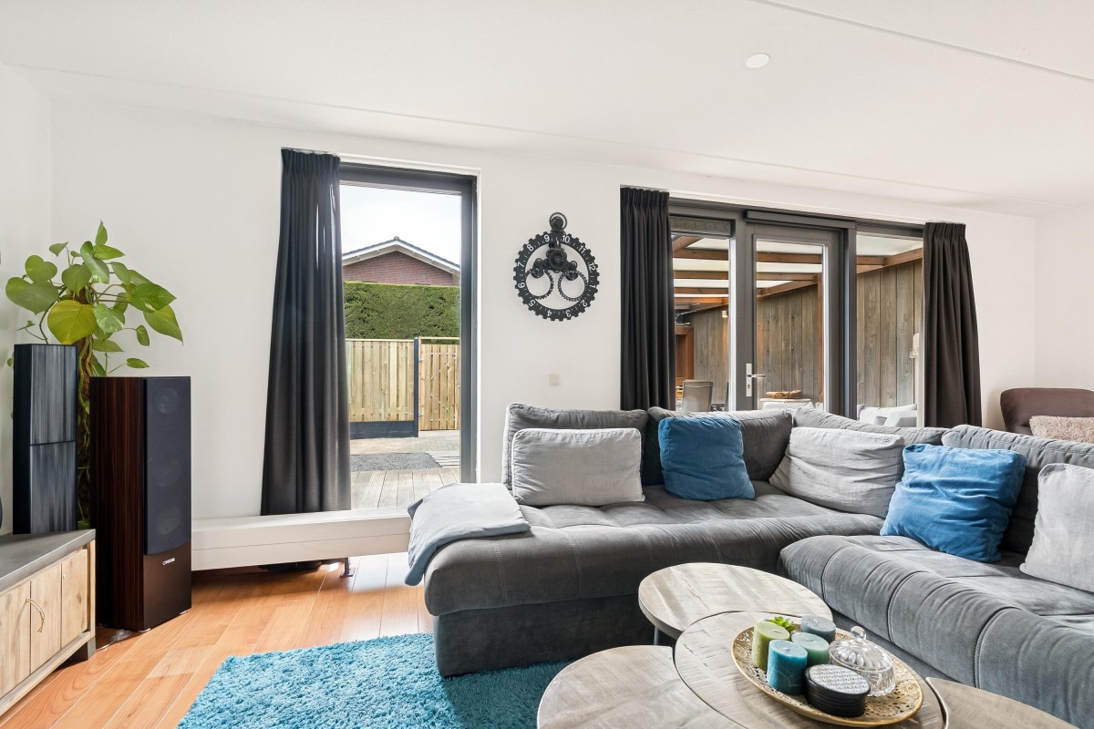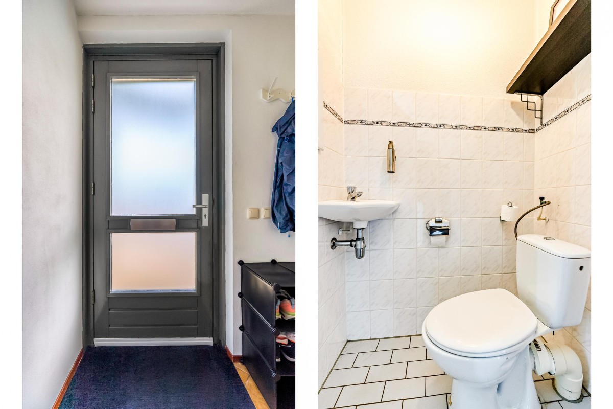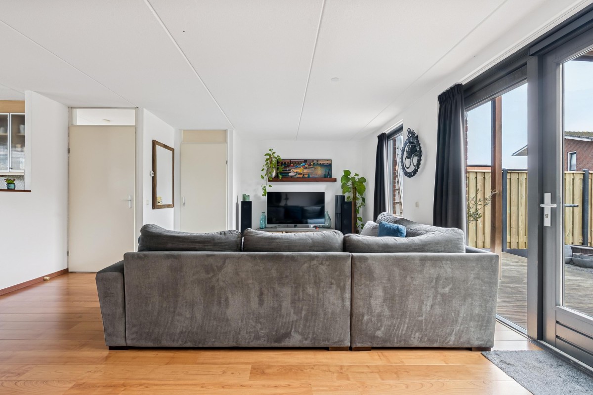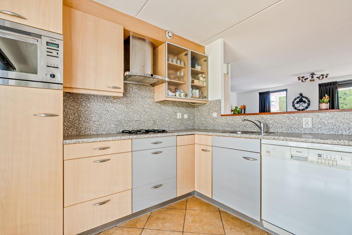 Je komt binnen in de hal, waar je toegang hebt tot de meterkast met glasvezelaansluiting, een toilet met fontein, de trap naar de eerste verdieping en de woonruimte. Aan de zijkant van de woonkamer bevindt zich een handige trapkast. De woonkamer is extra breed en voorzien van een laminaatvloer. Door de brede raampartijen komt er veel natuurlijk licht binnen en heb je goed zicht op de tuin, die via de openslaande deur bereikbaar is. De halfopen keuken ligt aan de voorzijde van de woning en is voorzien van inbouwapparatuur, zoals een combi-oven, een 4-pits gasfornuis, een afzuigkap en een vaatwasser. De vloer is betegeld met plavuizen en biedt voldoende ruimte voor een eettafel.