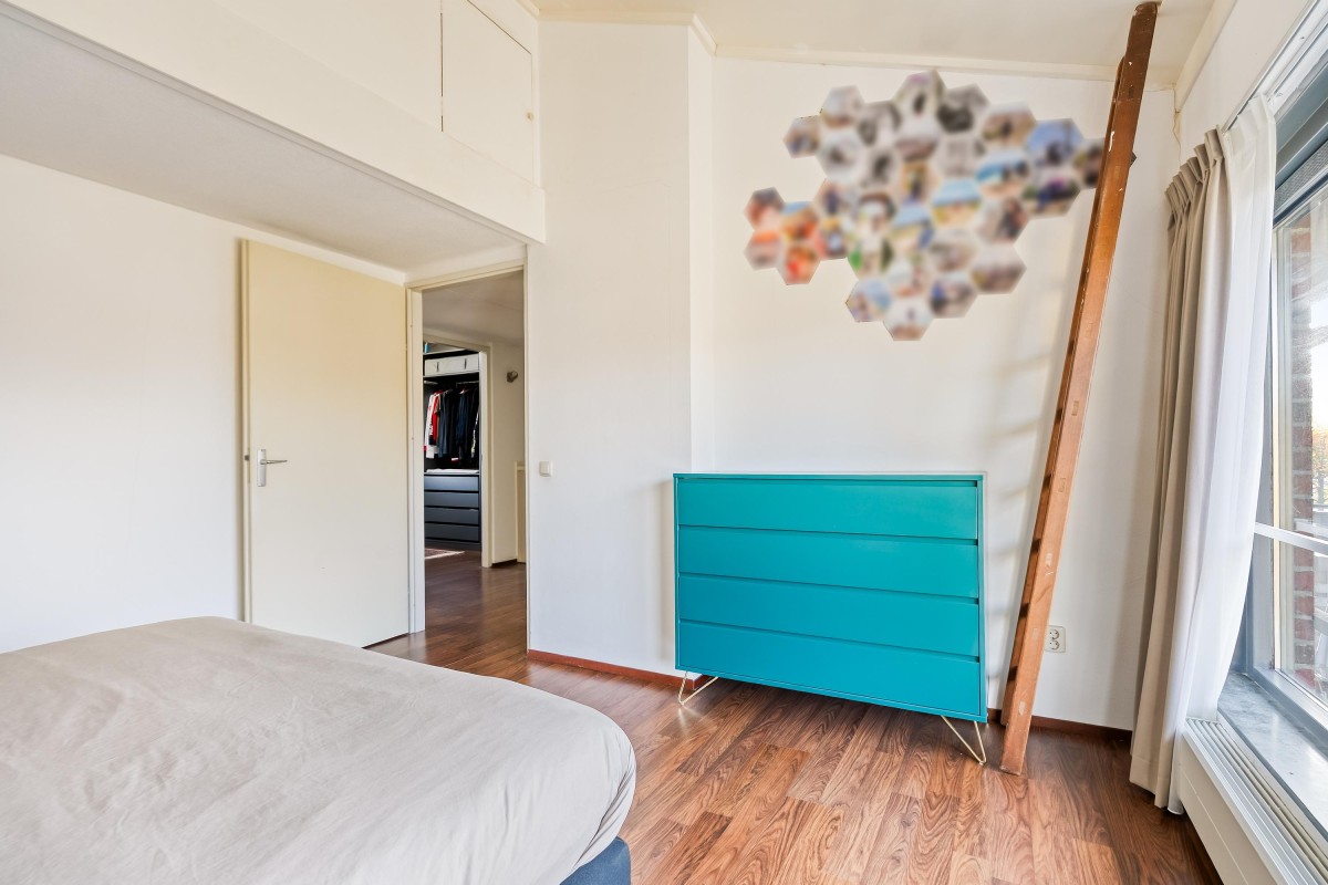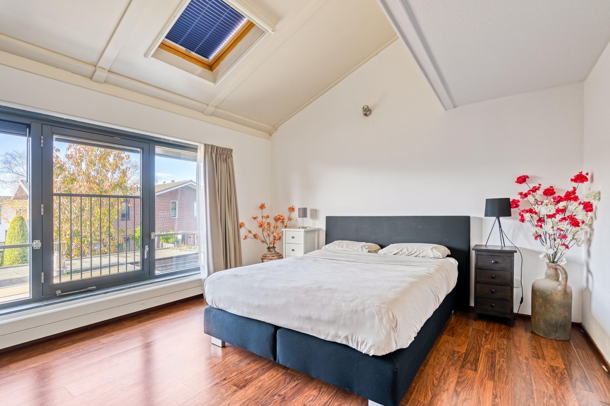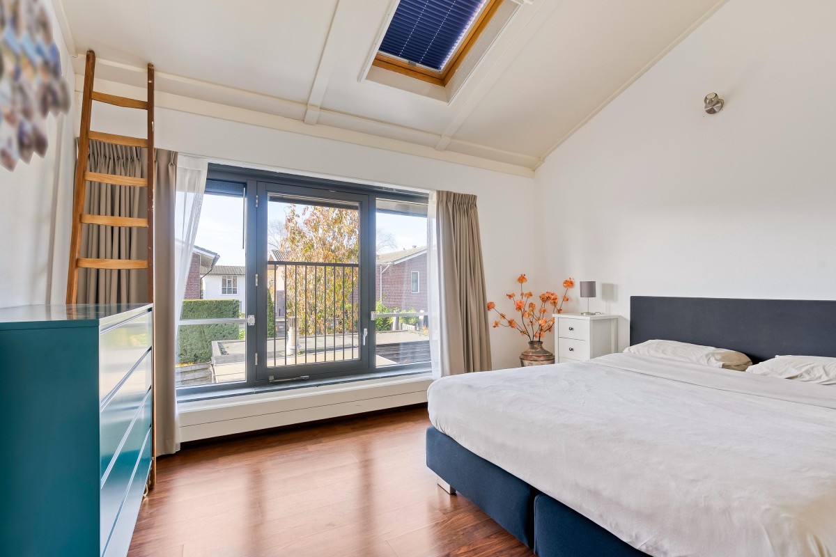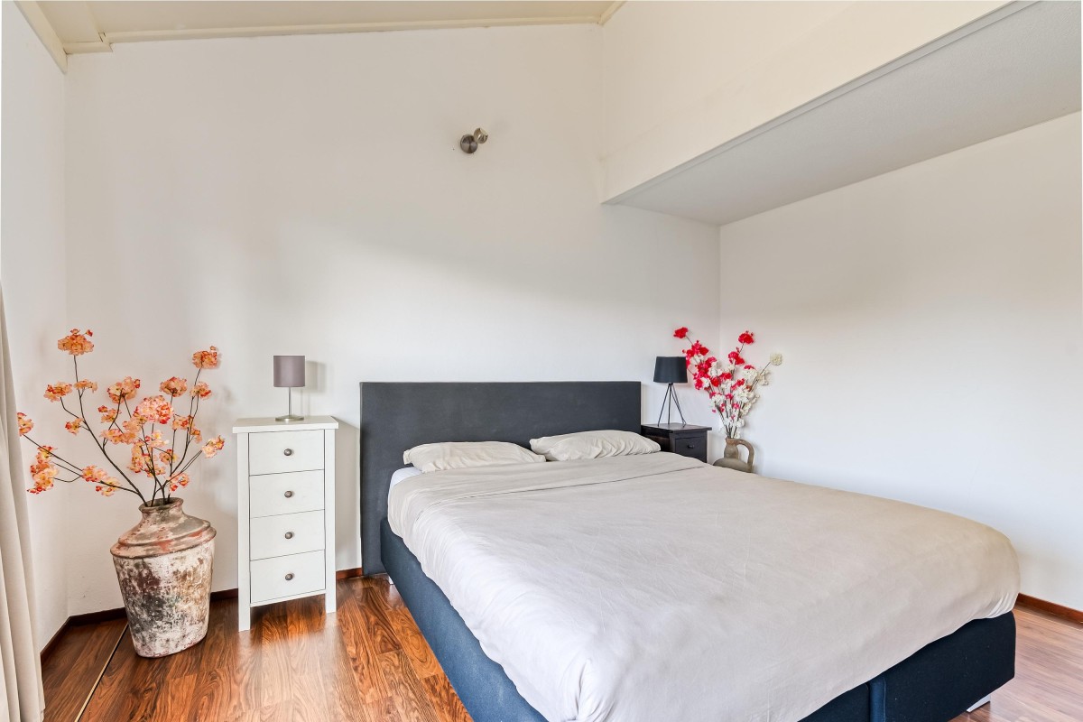 Op de eerste verdieping vind je drie slaapkamers, allen met hoge plafonds. Eén van de slaapkamers wordt op dit moment gebruikt als inloopkast. De twee andere slaapkamers hebben brede ramen, een Frans balkon en een dakraam. De hoofdslaapkamer ligt aan de achterzijde van de woning, met toegang tot de vliering. De badkamer is voorzien van een douchecabine, een wastafel, een toilet en aansluitingen voor de wasmachine en droger. Op de vliering is extra bergruimte en de mechanische ventilatie.