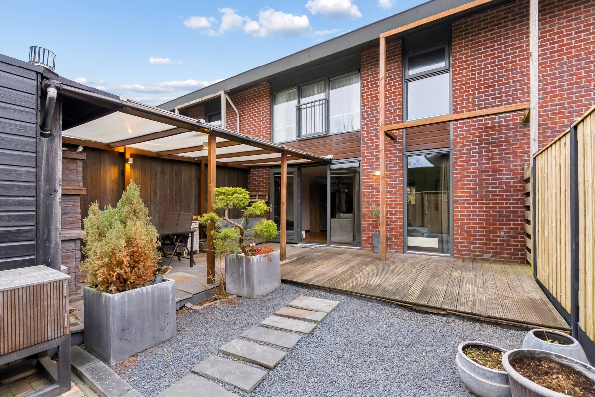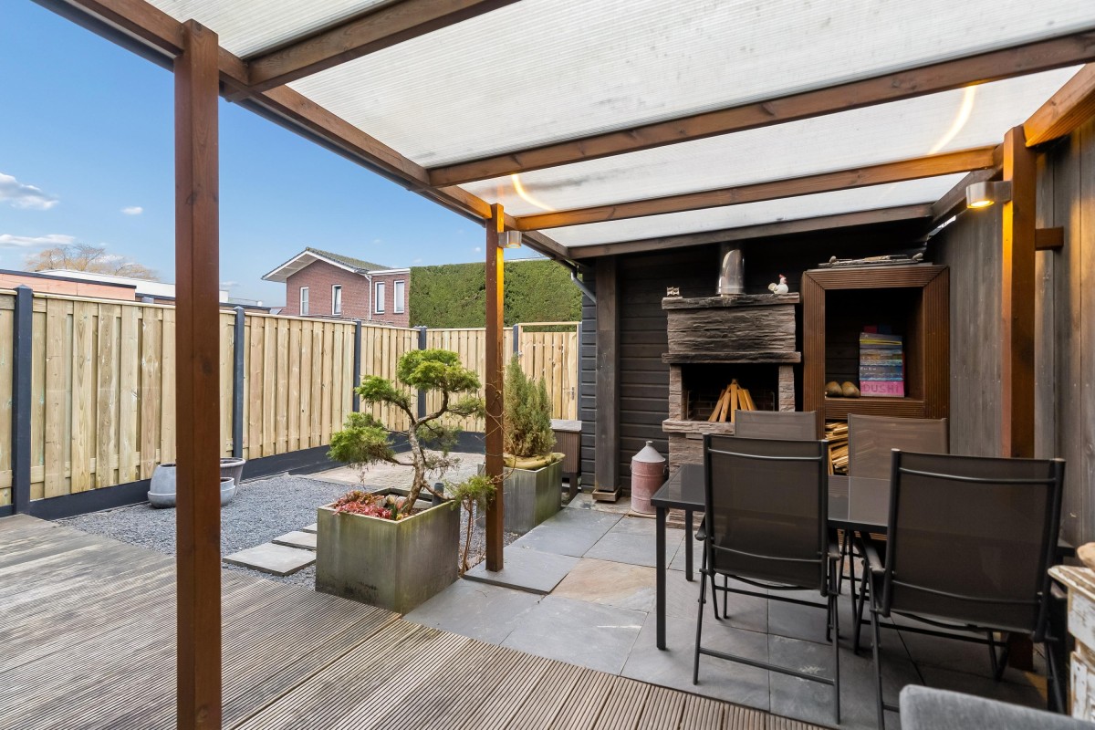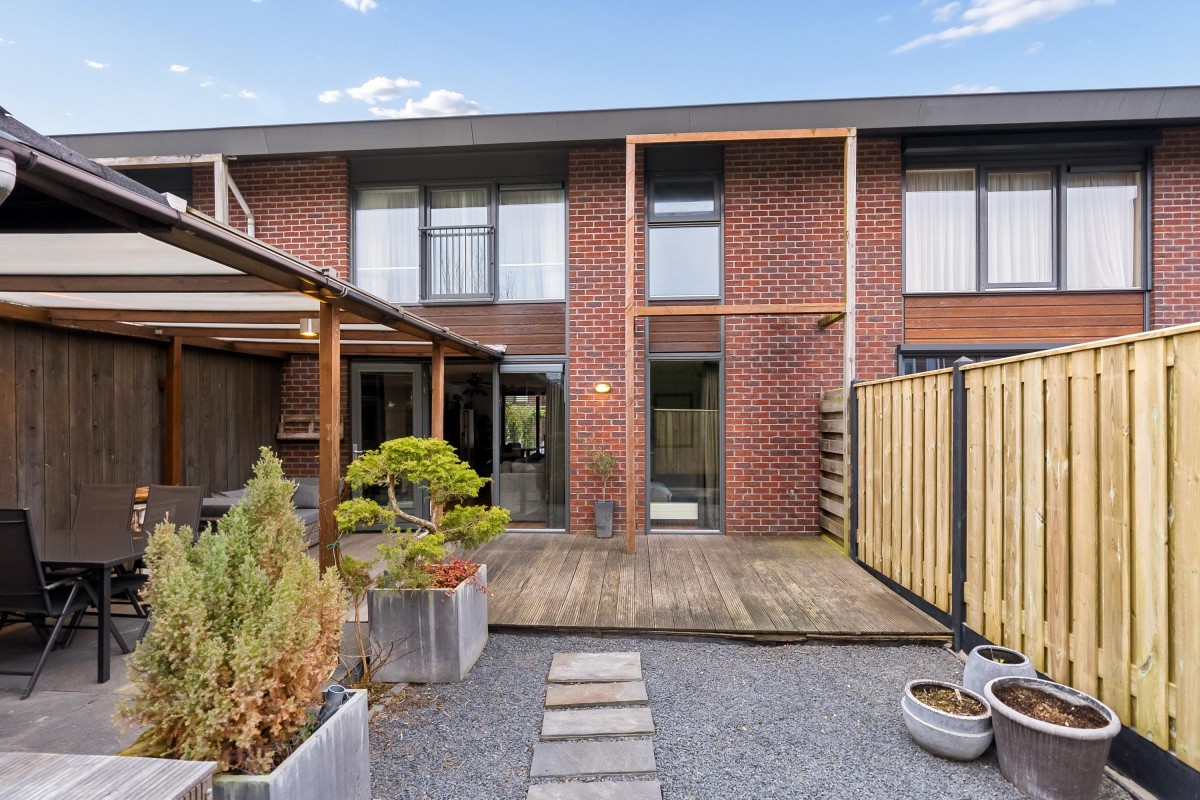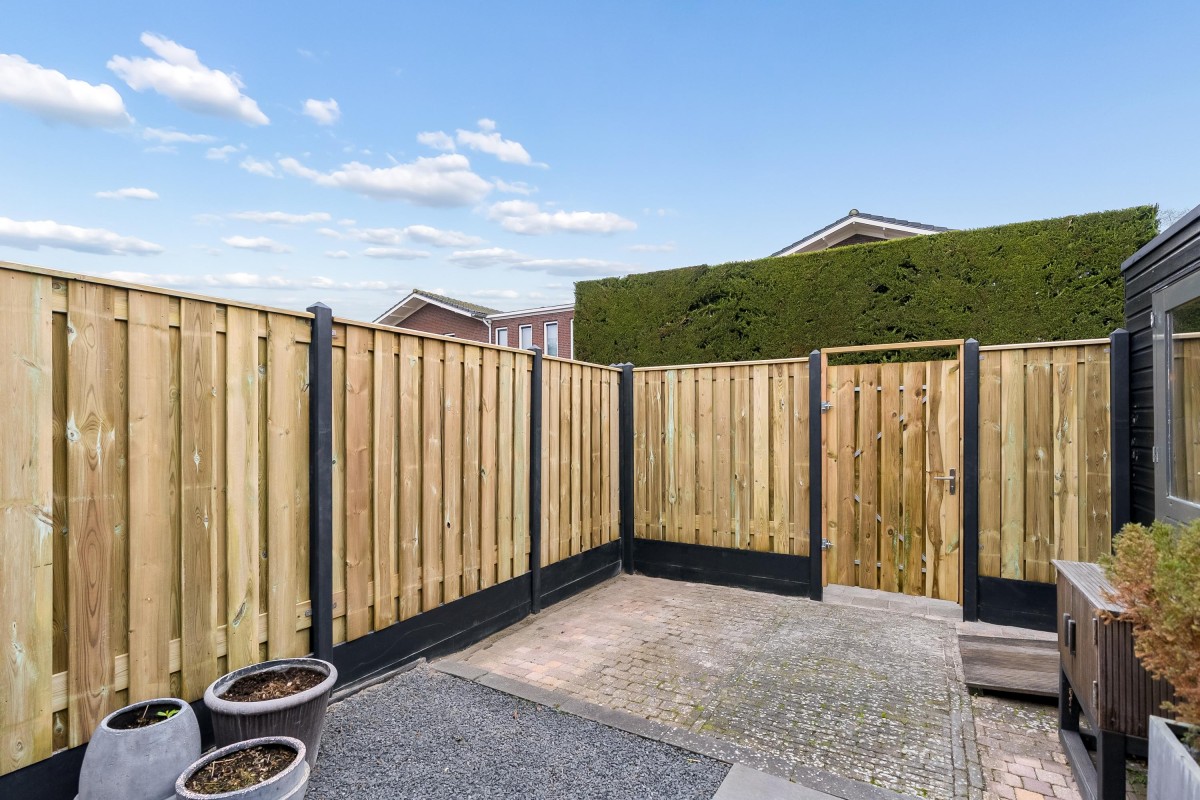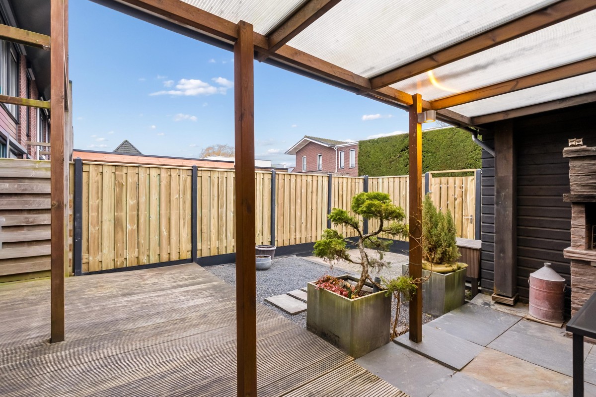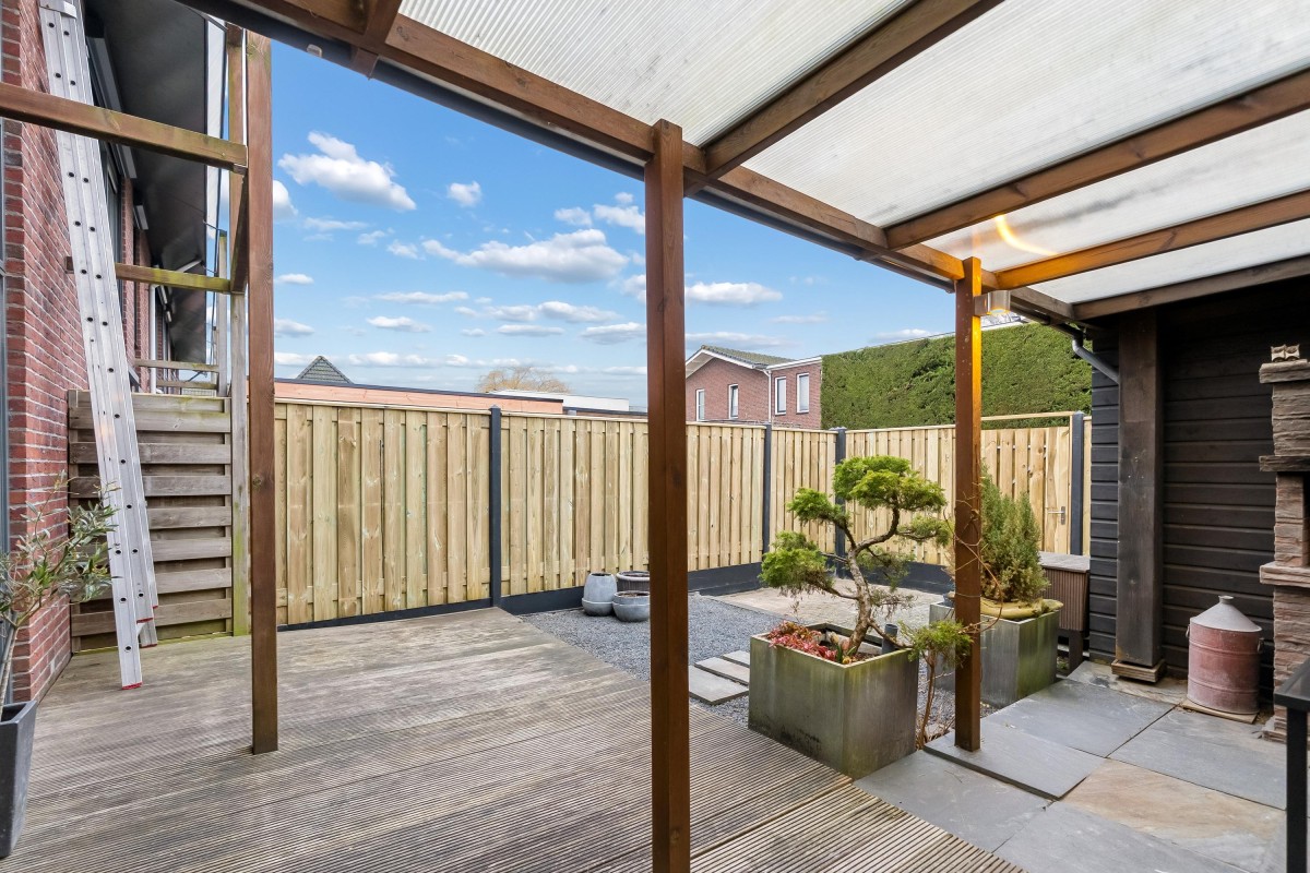 Aan de achterzijde van de woning ligt een zonnige tuin op het westen. Aan de rechterzijde van de tuin is een overkapping gerealiseerd, perfect voor het genieten van de zon. Zelfs wanneer het regent! De tuin is onderhoudsvriendelijk aangelegd met een vlonder, grind, betegeling en schuttingen. De schutting aan de linkerzijde zal binnenkort worden vervangen inclusief poort. Aan de achterzijde is een achterom.