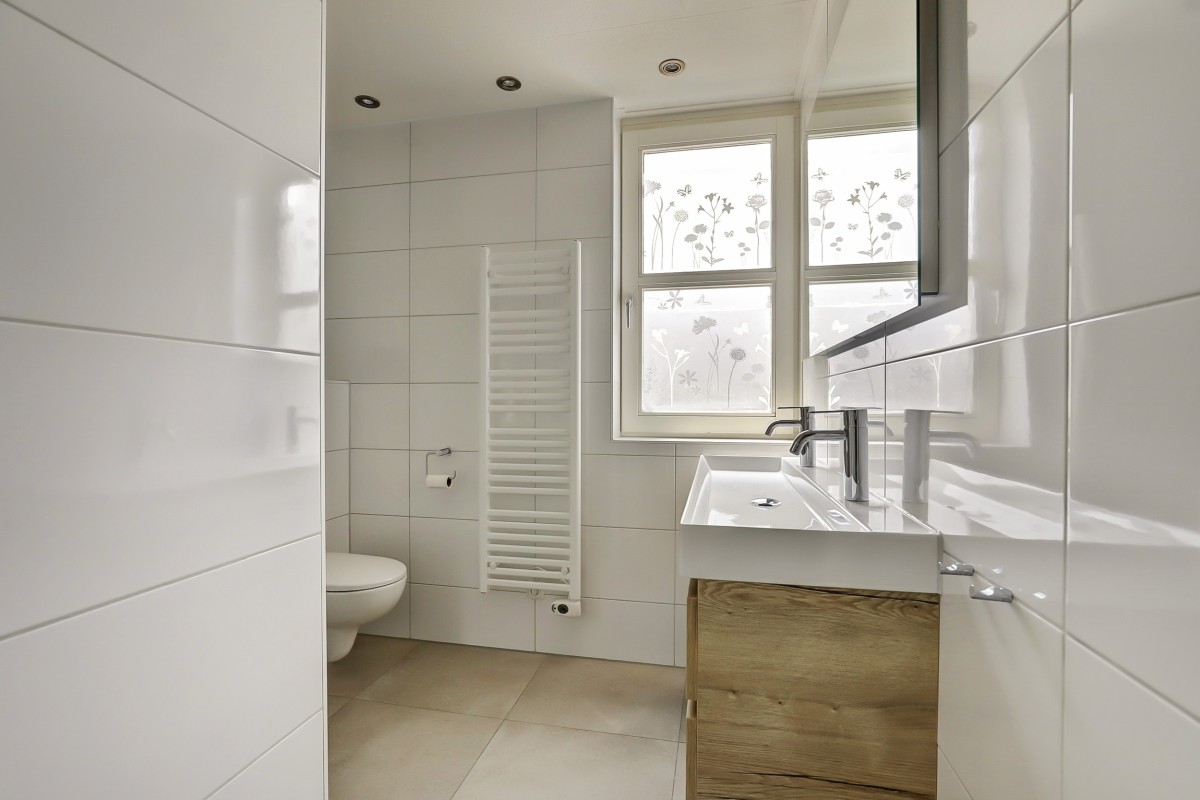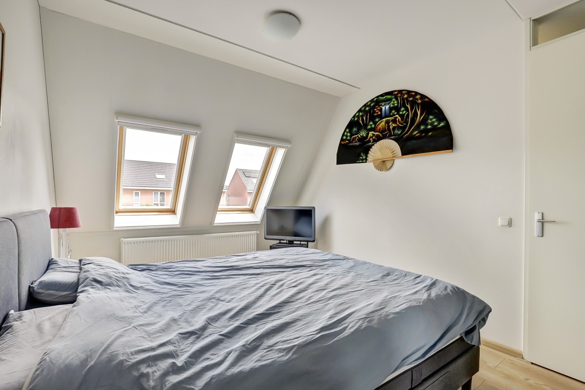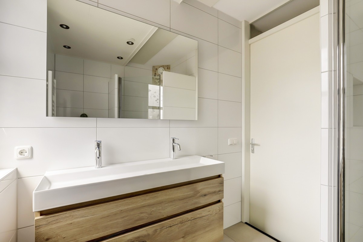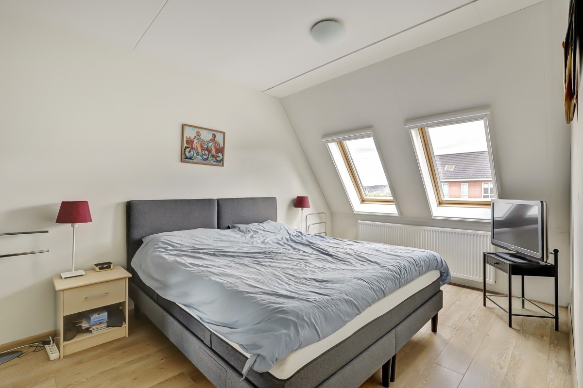 Eerste verdieping: Overloop met toegang tot drie slaapkamers en de nieuwe badkamer (2024). Aan de voorzijde bevindt zich een slaapkamer met dakkapel, naast de recent gemoderniseerde badkamer, die is voorzien van een inloopdouche, wandcloset, wastafelmeubel met dubbele kraan en een radiator. Aan de achterzijde zijn nog twee slaapkamers met Velux dakramen. De gehele verdieping is afgewerkt met een lichte laminaatvloer.
