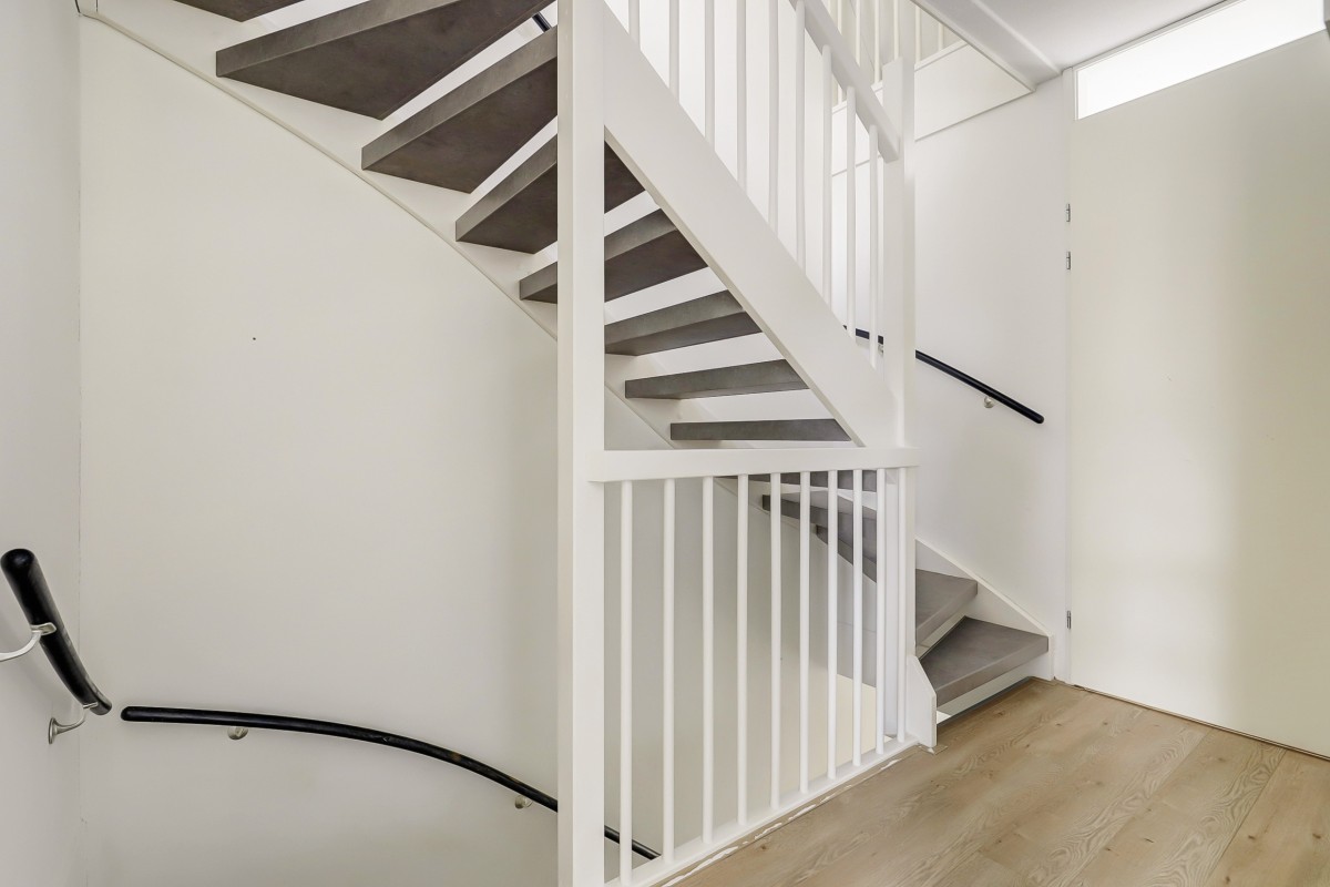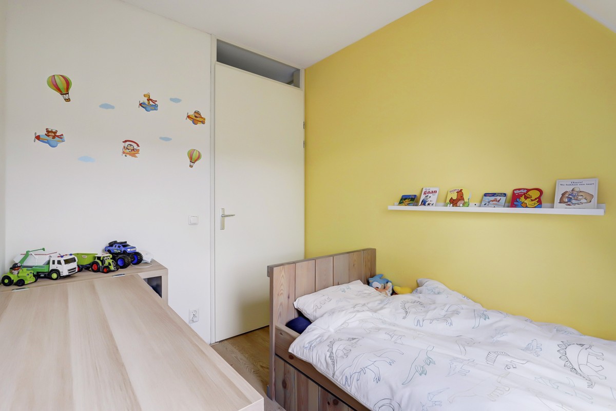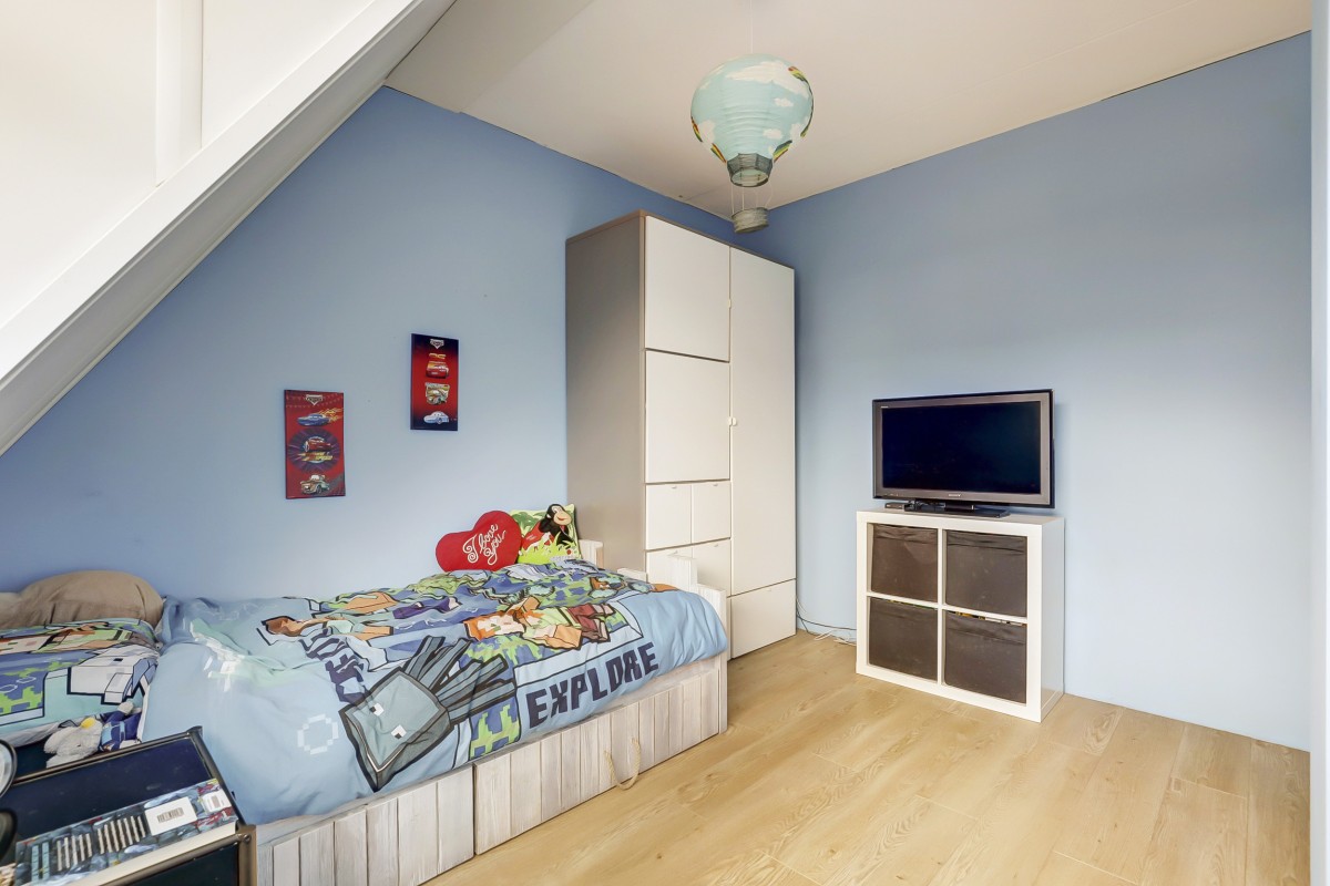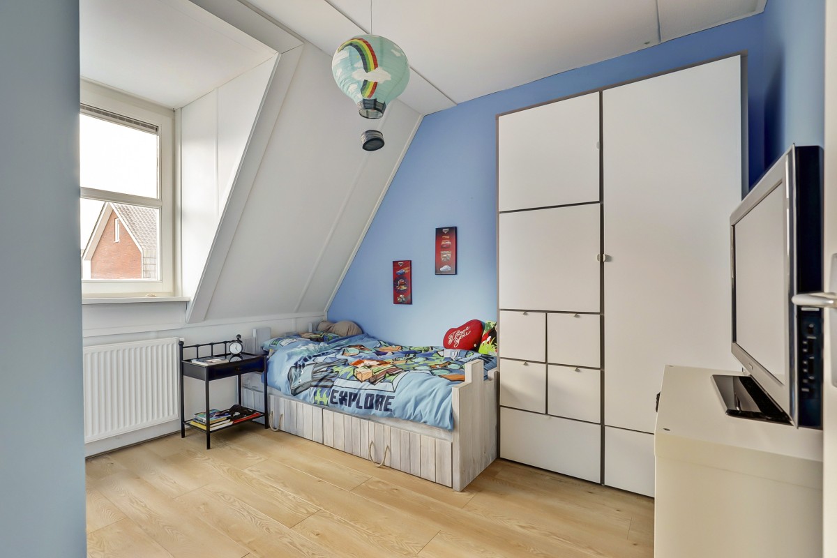 Eerste verdieping: Overloop met toegang tot drie slaapkamers en de nieuwe badkamer (2024). Aan de voorzijde bevindt zich een slaapkamer met dakkapel, naast de recent gemoderniseerde badkamer, die is voorzien van een inloopdouche, wandcloset, wastafelmeubel met dubbele kraan en een radiator. Aan de achterzijde zijn nog twee slaapkamers met Velux dakramen. De gehele verdieping is afgewerkt met een lichte laminaatvloer.