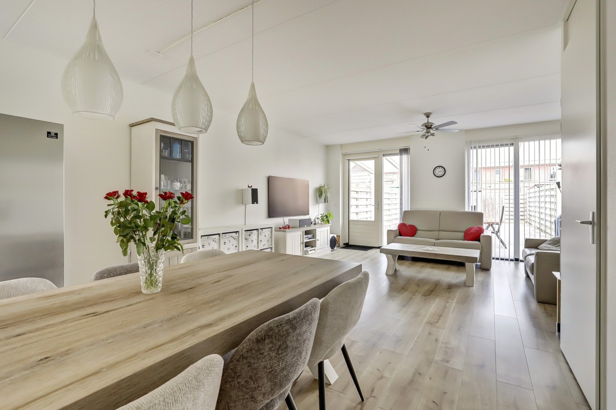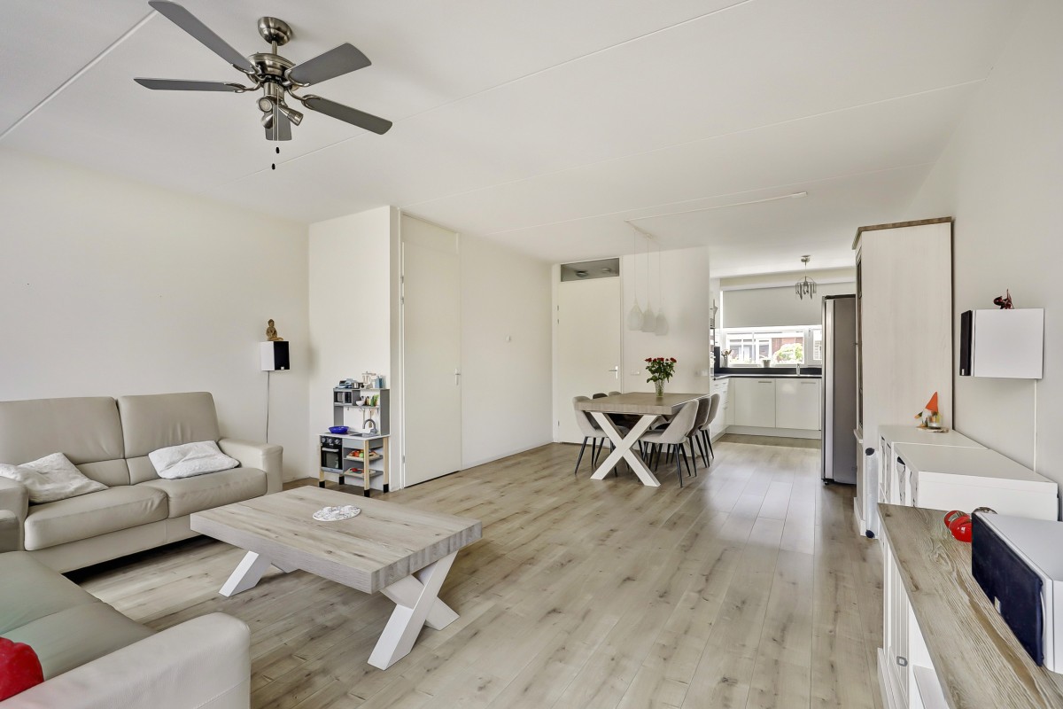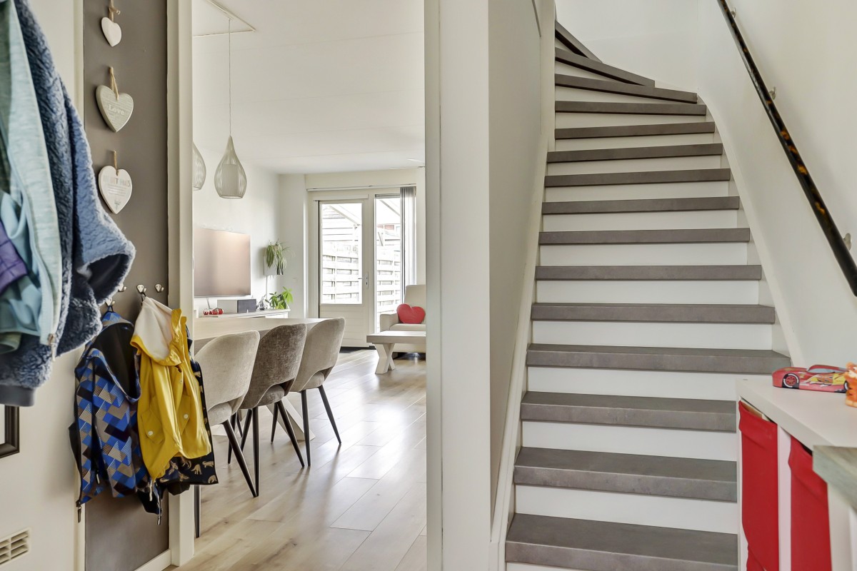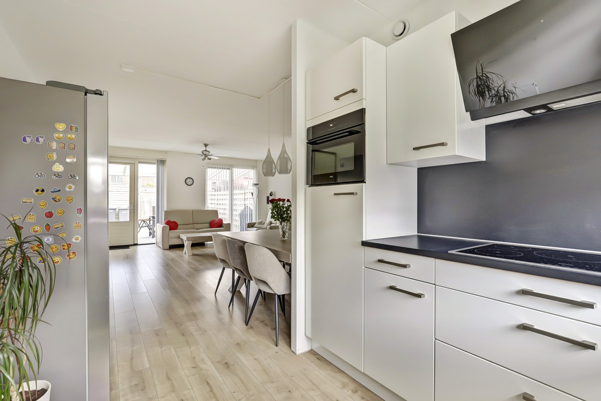 Begane grond: Verzorgde voortuin, overdekte entree, ruime hal met garderobe, meterkast en toiletruimte met hangend closet en fonteintje. Vanuit de hal toegang tot de lichte, tuingerichte woonkamer met praktische trapkast en een loopdeur naar de achtertuin. De eethoek grenst aan de open keuken in L-opstelling met witte fronten en een zwart kunststof werkblad. De keuken is straatgericht en voorzien van recent vernieuwde inbouwapparatuur, zoals een inductiekookplaat, afzuigkap, combimagnetron, koelkast en vaatwasser. De begane grond is afgewerkt met een lichte laminaatvloer.