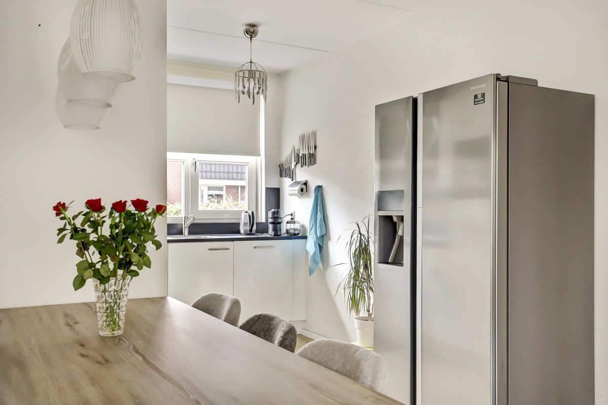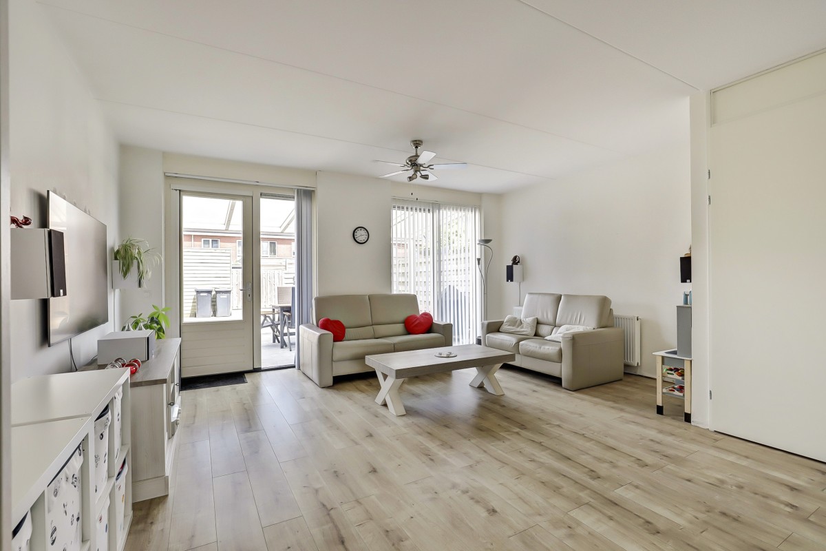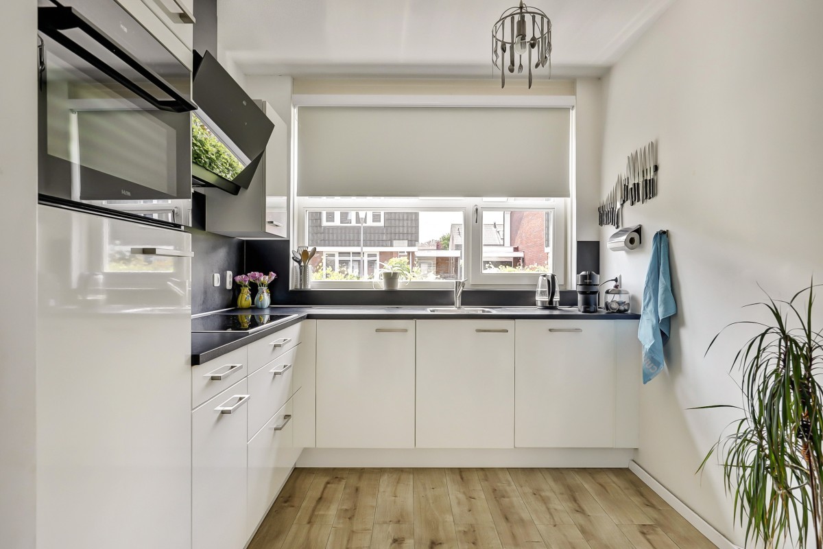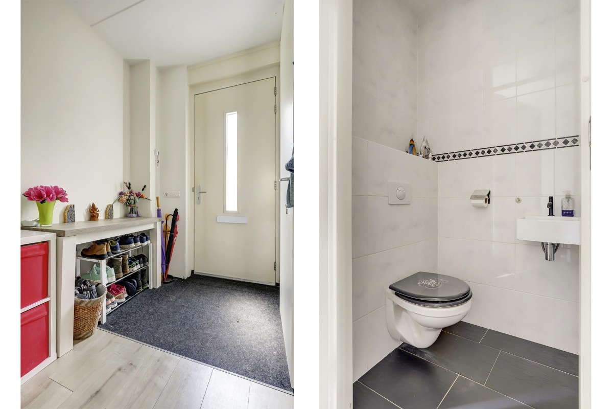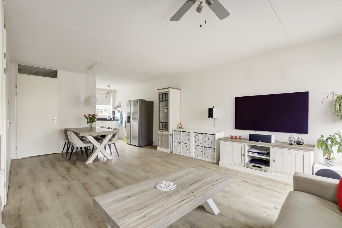 Begane grond: Verzorgde voortuin, overdekte entree, ruime hal met garderobe, meterkast en toiletruimte met hangend closet en fonteintje. Vanuit de hal toegang tot de lichte, tuingerichte woonkamer met praktische trapkast en een loopdeur naar de achtertuin. De eethoek grenst aan de open keuken in L-opstelling met witte fronten en een zwart kunststof werkblad. De keuken is straatgericht en voorzien van recent vernieuwde inbouwapparatuur, zoals een inductiekookplaat, afzuigkap, combimagnetron, koelkast en vaatwasser. De begane grond is afgewerkt met een lichte laminaatvloer.