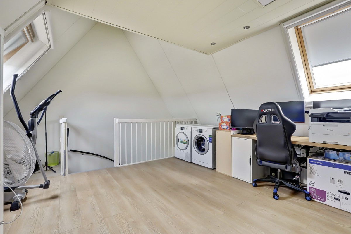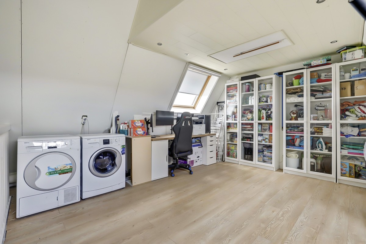 Tweede verdieping: Via vaste trap bereikbaar. De zolder is voorzien van twee Velux dakramen voorzien van horren en zonwering aan de buitenzijde en een verlaagd plafond met inbouwspots. Hier bevinden zich de aansluitingen voor wasmachine en droger. Deze ruimte biedt de mogelijkheid tot het realiseren van een vierde slaapkamer. Tevens is hier een praktische bergvliering aangebracht.