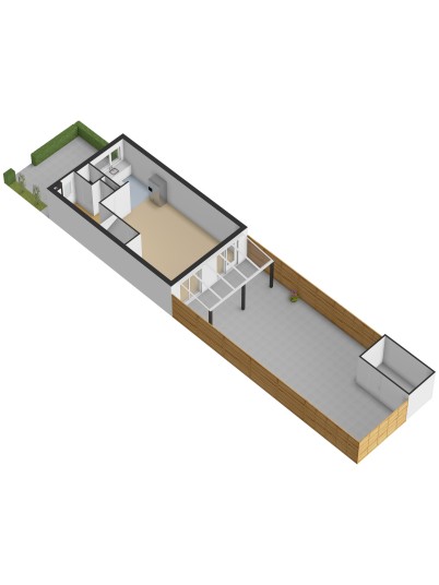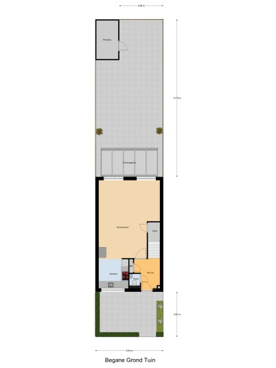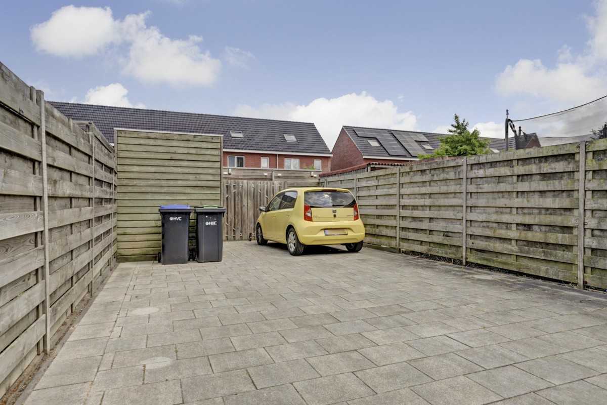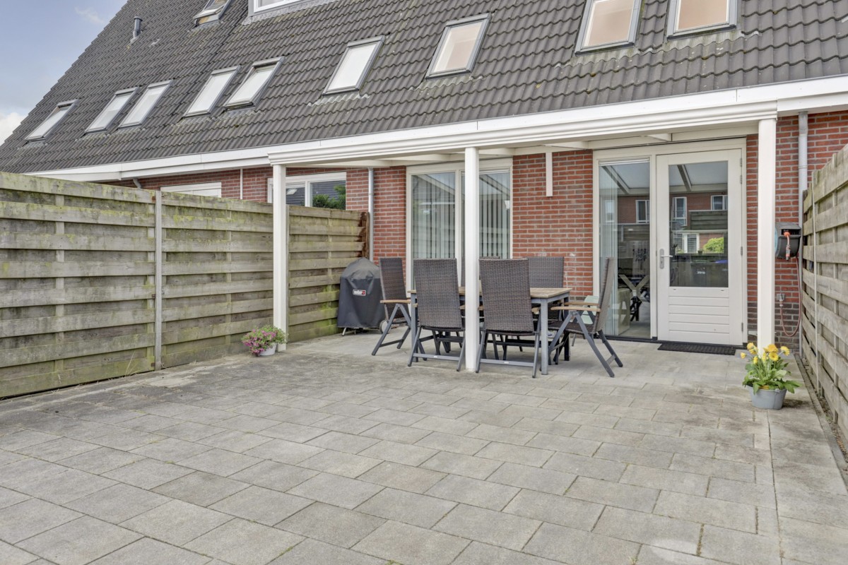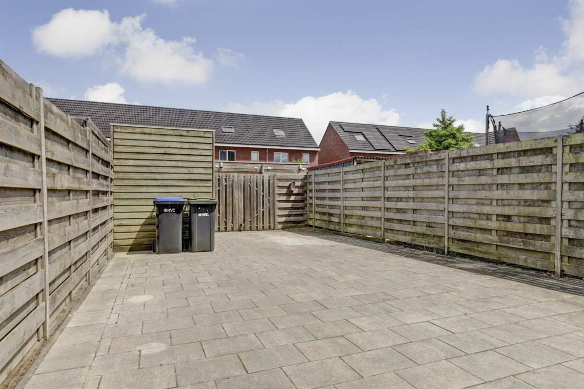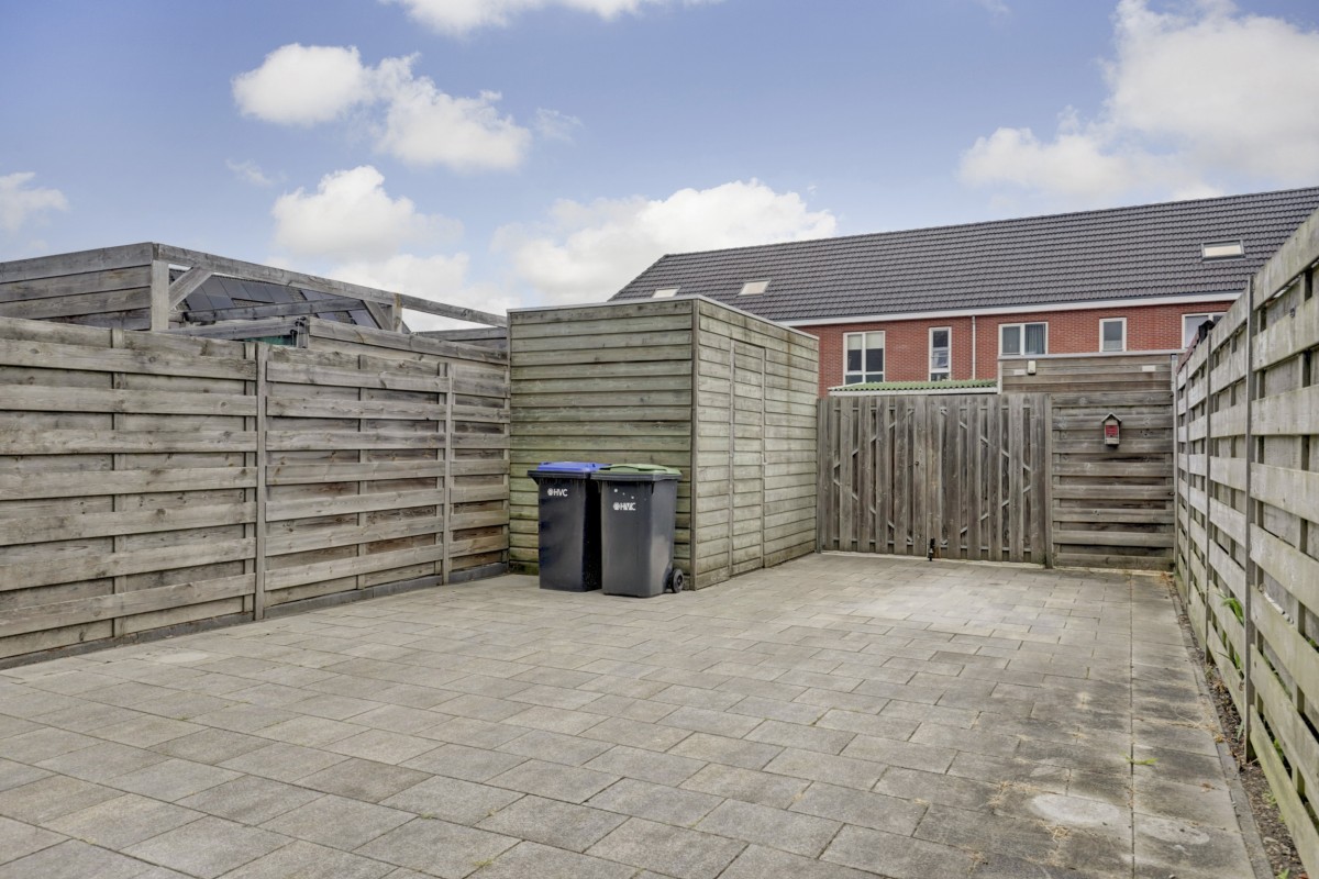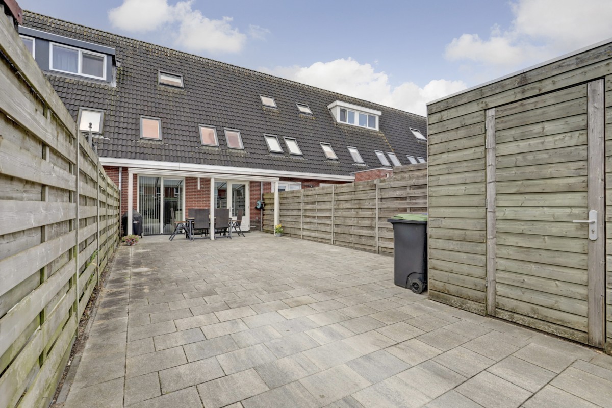 Tuin: De achtertuin is onderhoudsvriendelijk aangelegd met bestrating, een houten berging met elektra en een overkapping aan de achtergevel. De tuin is achterom bereikbaar en biedt de mogelijkheid om een auto te stallen.