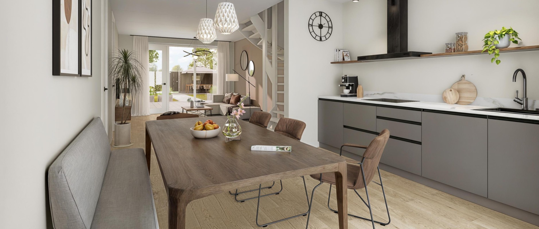 Deze rijwoningen hebben een grote leefruimte met een sfeervolle woonkeuken aan de voorzijde. De pui aan de achterzijde verbindt de zithoek met de tuin. Boven bevinden zich een badkamer, drie slaapkamers en een zolder. Hier kun je bijvoorbeeld een kantoor of extra slaapkamer creëren. Parkeren kan voor de deur en bij de hoekwoningen op de eigen oprit.