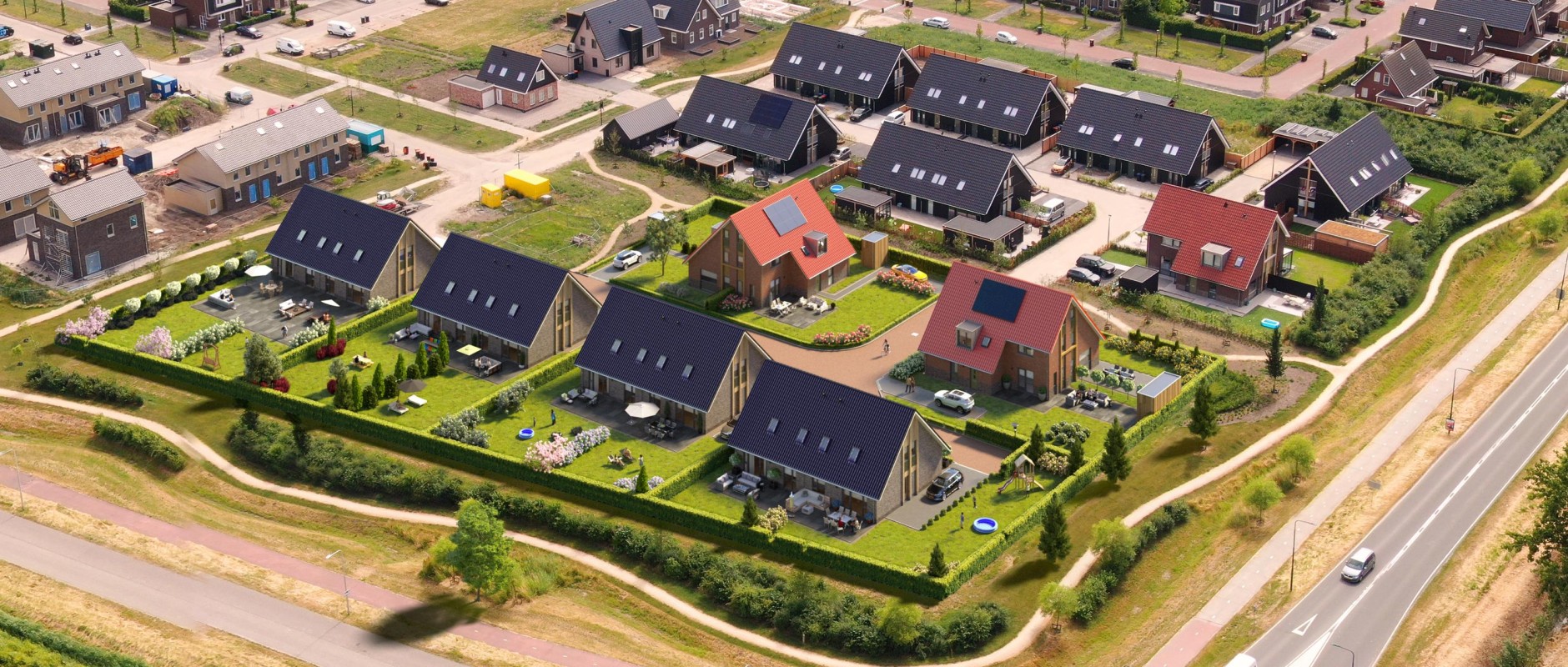 De boerderijwoningen doen, zoals de naam al aangeeft, denken aan de oude boerderijen van het Hollandse platteland. Kenmerkend zijn de grote kap en lage gootlijn met gedetailleerde afwerking. De vier boerderijwoningen hebben een gespiegelde indeling, zodat je kunt kiezen uit een straatgerichte woonkamer of een tuingerichte woonkamer.