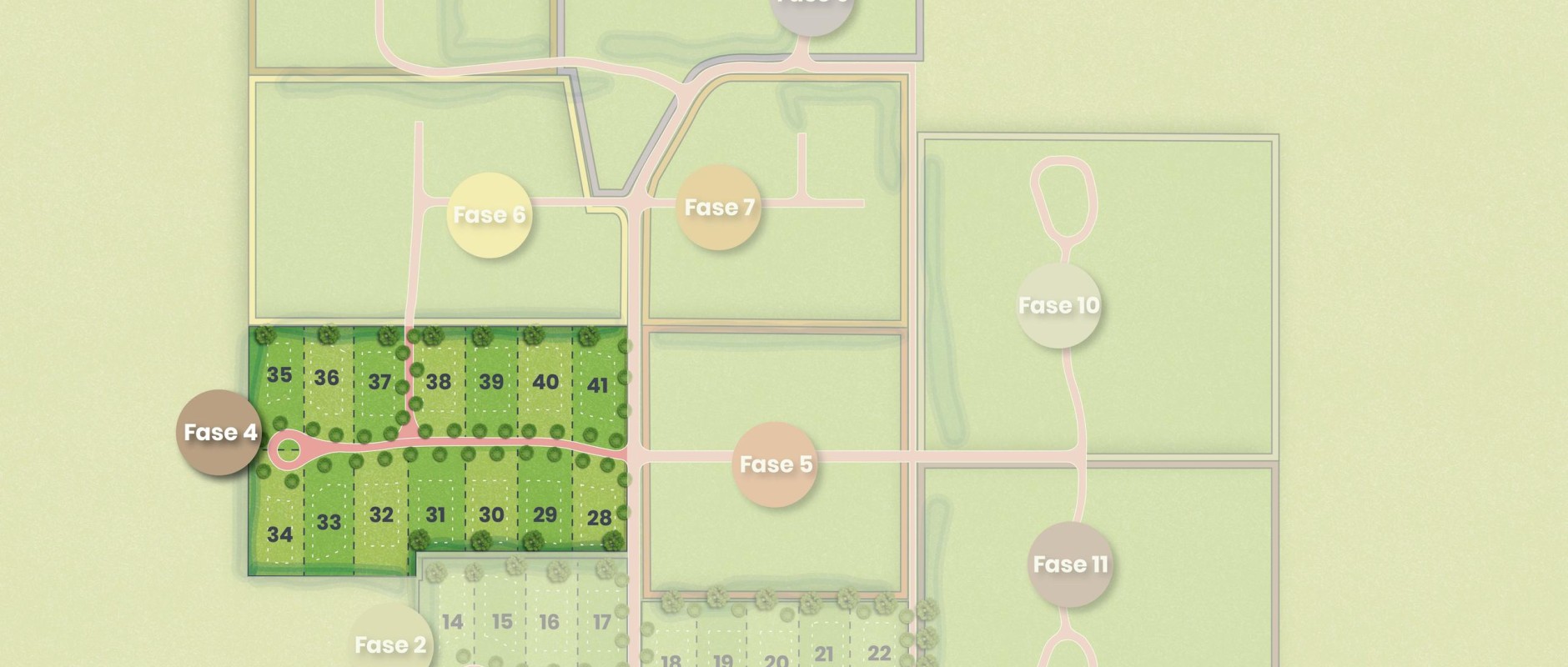 De 14 kavels van fase 4 liggen aan de sfeervolle erfweg, als een exclusieve buitenplaats binnen LOOV. Aan het einde van deze buitenplaats ligt een bescheiden rotonde, waardoor auto’s gemakkelijk kunnen keren en de entree rustig en overzichtelijk blijft.
