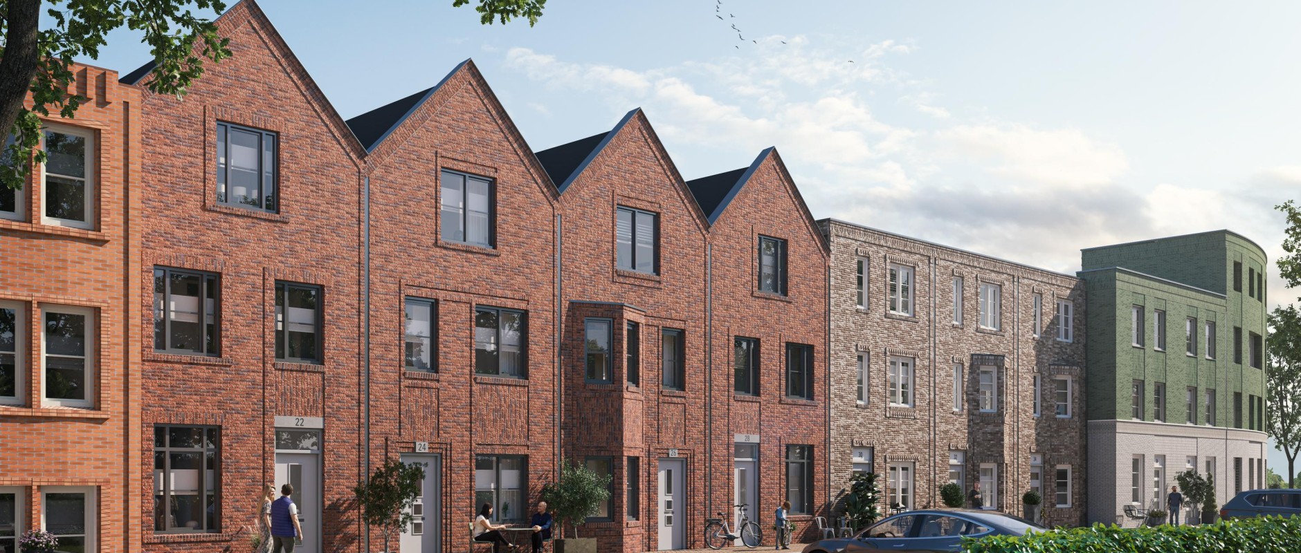 Stoere woningen met een echte Brooklyn-vibe door de donkerrode steen, het puntdak en het gevarieerde gevelbeeld met rijk gedetailleerd metselwerk en vooruitspringende gevel. De keuken bevindt zich aan de voorzijde van de woning en de woonkamer aan de tuinzijde. De 4 koopwoningen met een beukmaat van 5,4 m2 hebben een verrassend veel leefruimte van begane grond tot aan de nok.