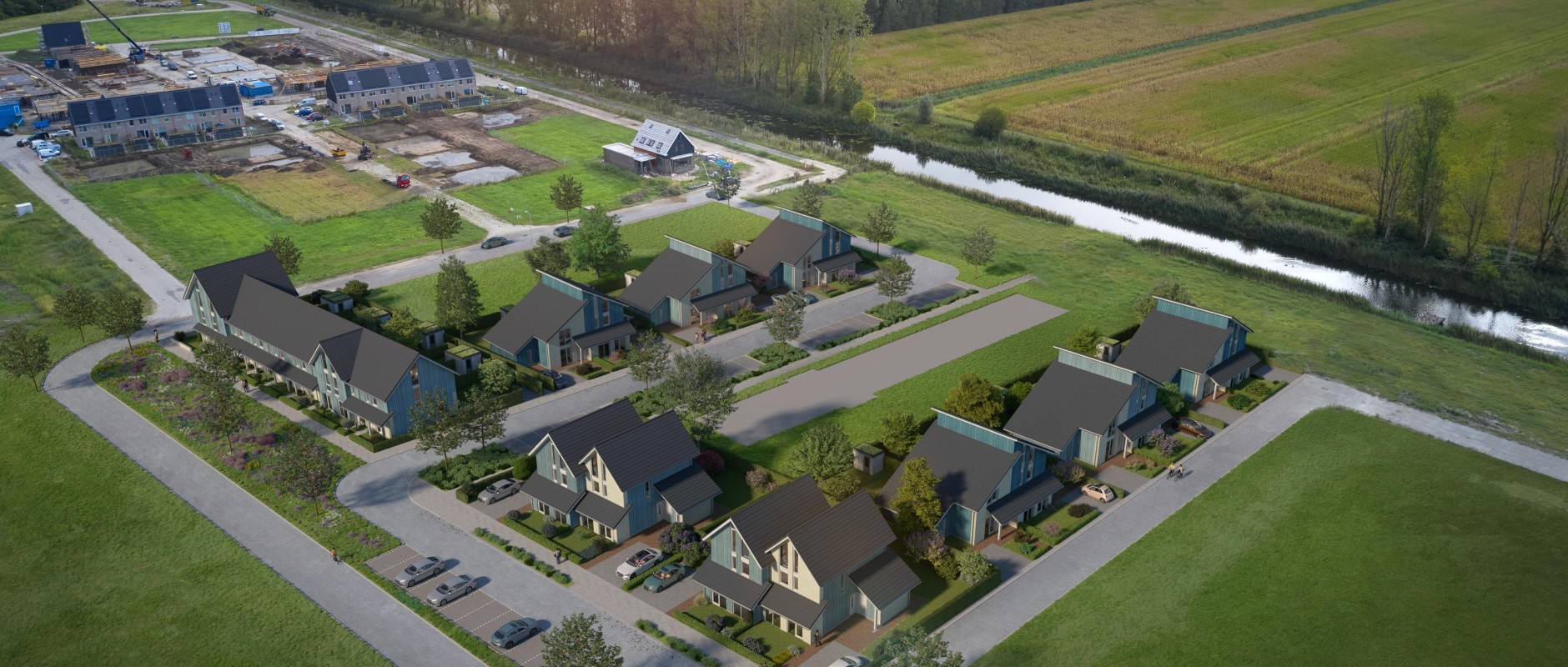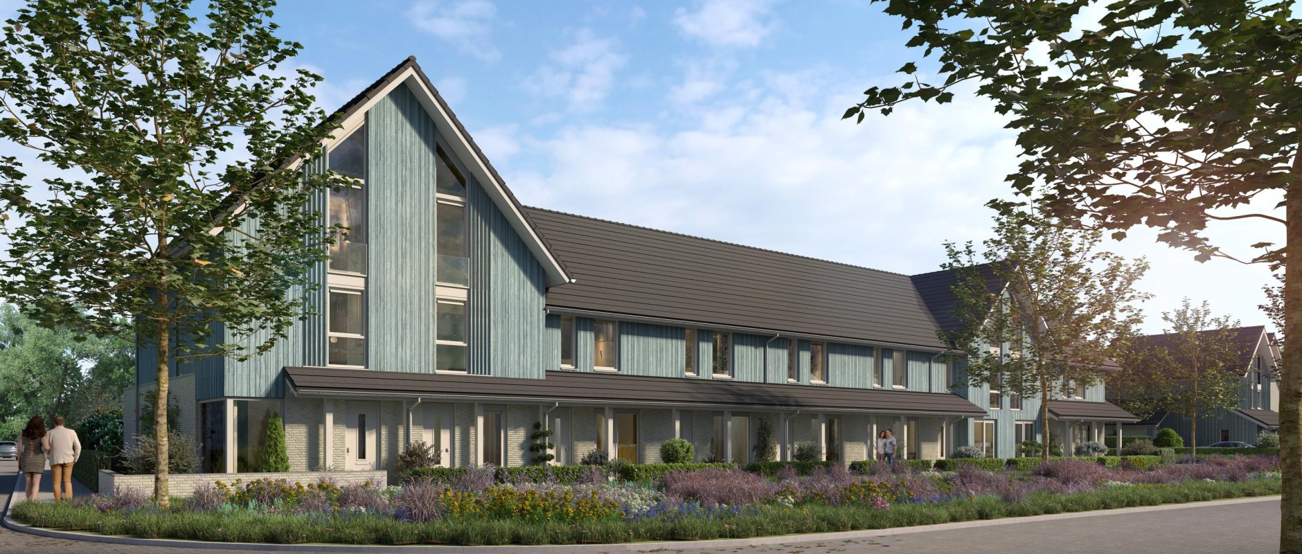De rijwoningen kijken uit op de groene zone. De woningen hebben aan de voorzijde een luifel/veranda, waaronder je kunt genieten van de avondzon. De twee smalle hoge woningen op de hoek geven het blok een unieke uitstraling.