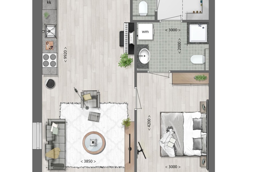 De woningen hebben allemaal een fijne open keuken centraal in de woning. Aan de ene kant kun je een eettafel kwijt waar je heerlijk kunt genieten van een kop koffie en een krant. En aan de andere kant creëer je een fijne zitplek met uitzicht op het terras. Via de woonkamer heb je ook toegang tot de slaapkamer. Aangrenzend vind je de badkamer met ruimte voor een douche, wastafel en tweede toilet. De badkamer is ook te bereiken via de hal. Via de trap in de hal bereik je de verdieping. Een overloop met veel ruimte voor spullen en een royale kamer die je kunt gebruiken als slaapkamer.