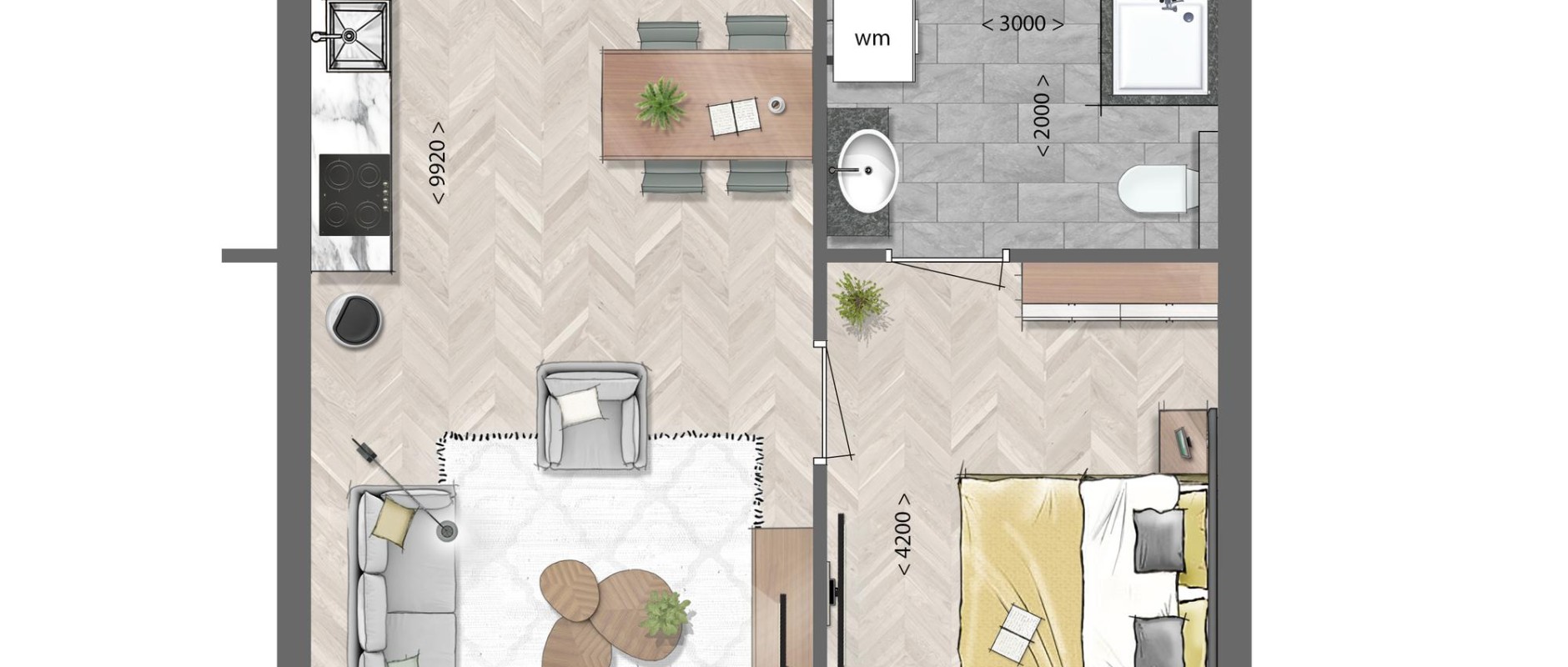 De woningen hebben allemaal een fijne open keuken centraal in de woning. Aan de ene kant kun je een eettafel kwijt waar je heerlijk kunt genieten van een kop koffie en een krant. En aan de andere kant creëer je een fijne zitplek met uitzicht op het terras. Via de woonkamer heb je ook toegang tot de slaapkamer. Aangrenzend vind je de badkamer met ruimte voor een douche, wastafel en tweede toilet. De badkamer is ook te bereiken via de hal. Via de trap in de hal bereik je de verdieping.