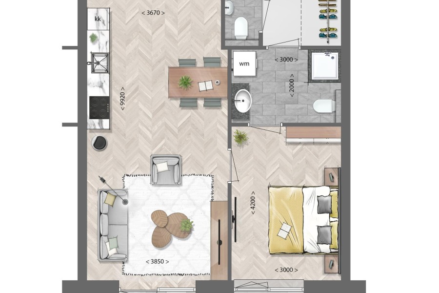 De woningen hebben allemaal een fijne open keuken centraal in de woning. Aan de ene kant kun je een eettafel kwijt waar je heerlijk kunt genieten van een kop koffie en een krant. En aan de andere kant creëer je een fijne zitplek met uitzicht op het terras. Via de woonkamer heb je ook toegang tot de slaapkamer. Aangrenzend vind je de badkamer met ruimte voor een douche, wastafel en tweede toilet. De badkamer is ook te bereiken via de hal. Via de trap in de hal bereik je de verdieping.