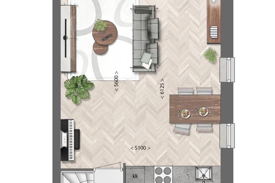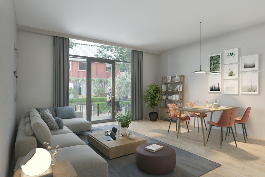 Via de centrale hal kom je bij je woning. Via de voordeur van je woning kom je eerst in de hal waar je ook het toilet en meterkast vindt. Via de hal open je de deur naar de woonkamer met openslaande deuren naar je eigen terras en een royale keuken die van alle gemakken is voorzien.