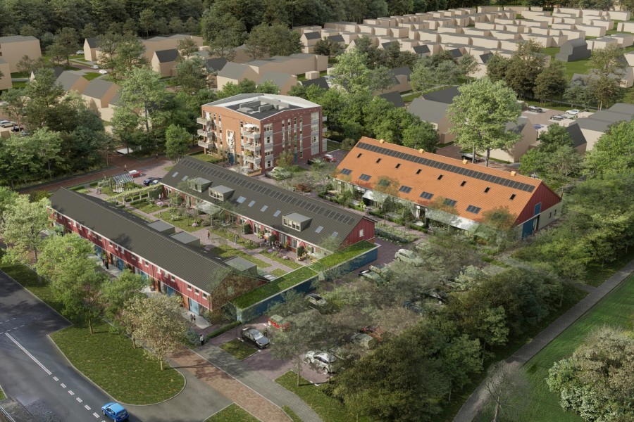 Op Het Erf vind je 16 Rug-aan-Rug woningen en verwijzen naar de historische schuur. Op deze plek stond de oude manege.