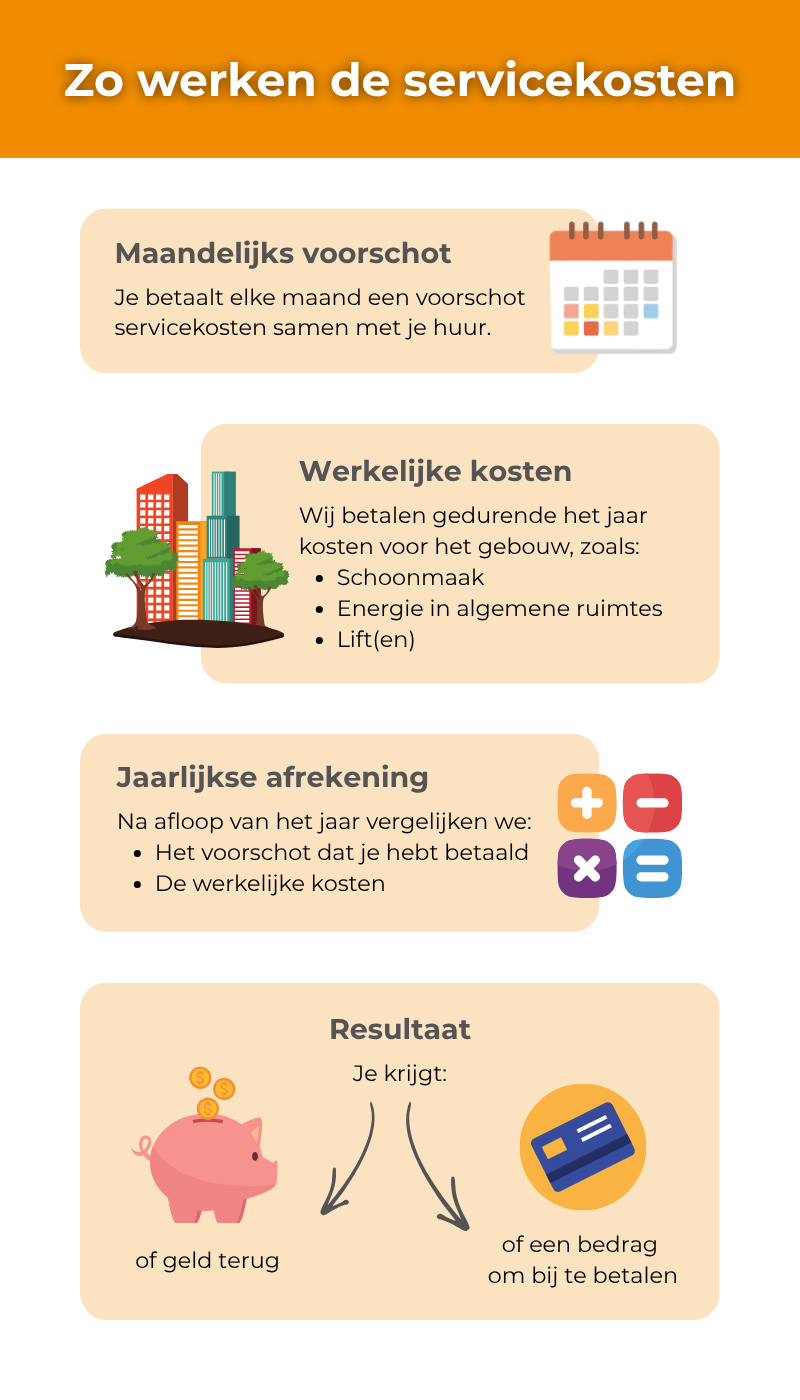 Je betaalt elke maand een voorschot voor de servicekosten. In het jaar daarna ontvang je, uiterlijk vóór 1 juli, de servicekostenafrekening over het voorgaande kalenderjaar. Hierin staat hoeveel voorschot je hebt betaald en wat de werkelijke kosten waren. Zo kun je controleren of de kosten kloppen en zie je of je geld terugkrijgt of een bedrag moet bijbetalen.